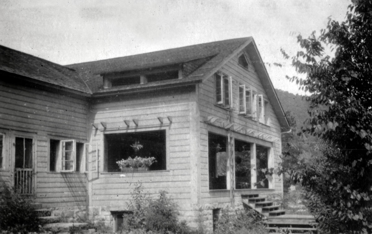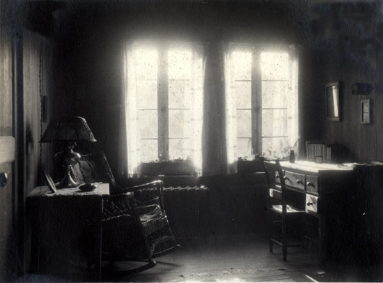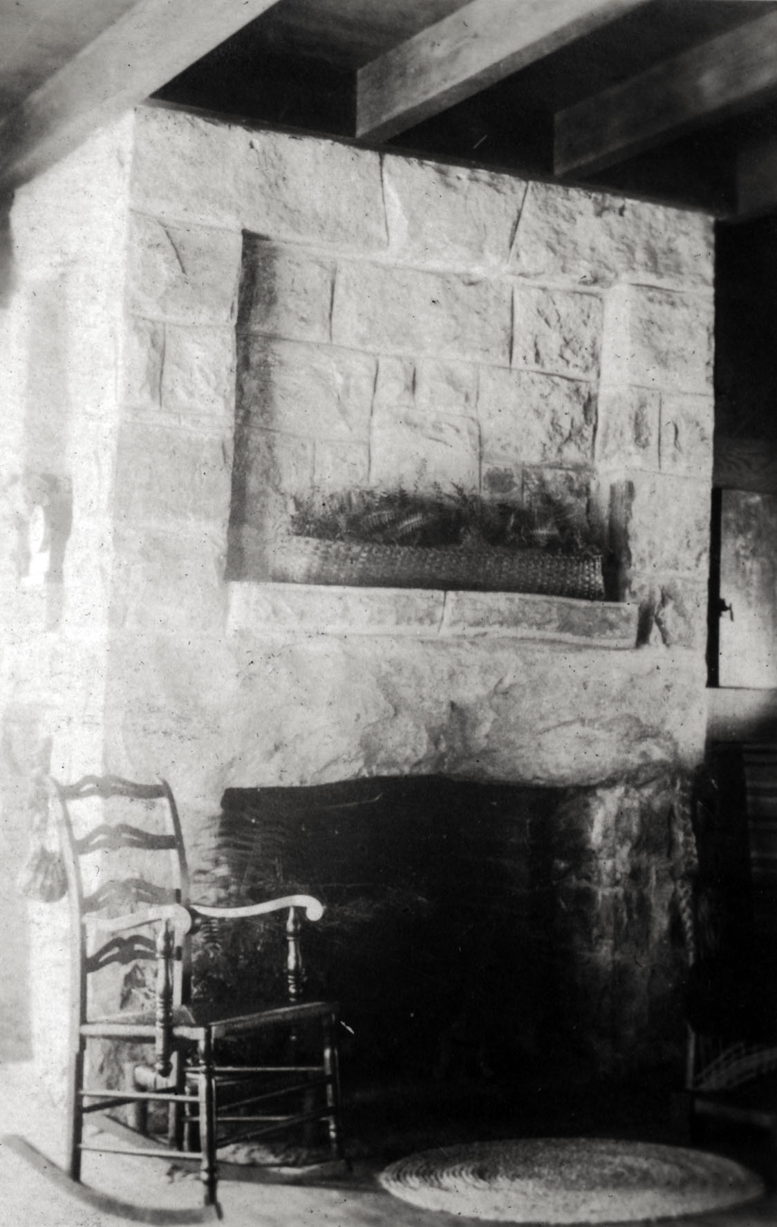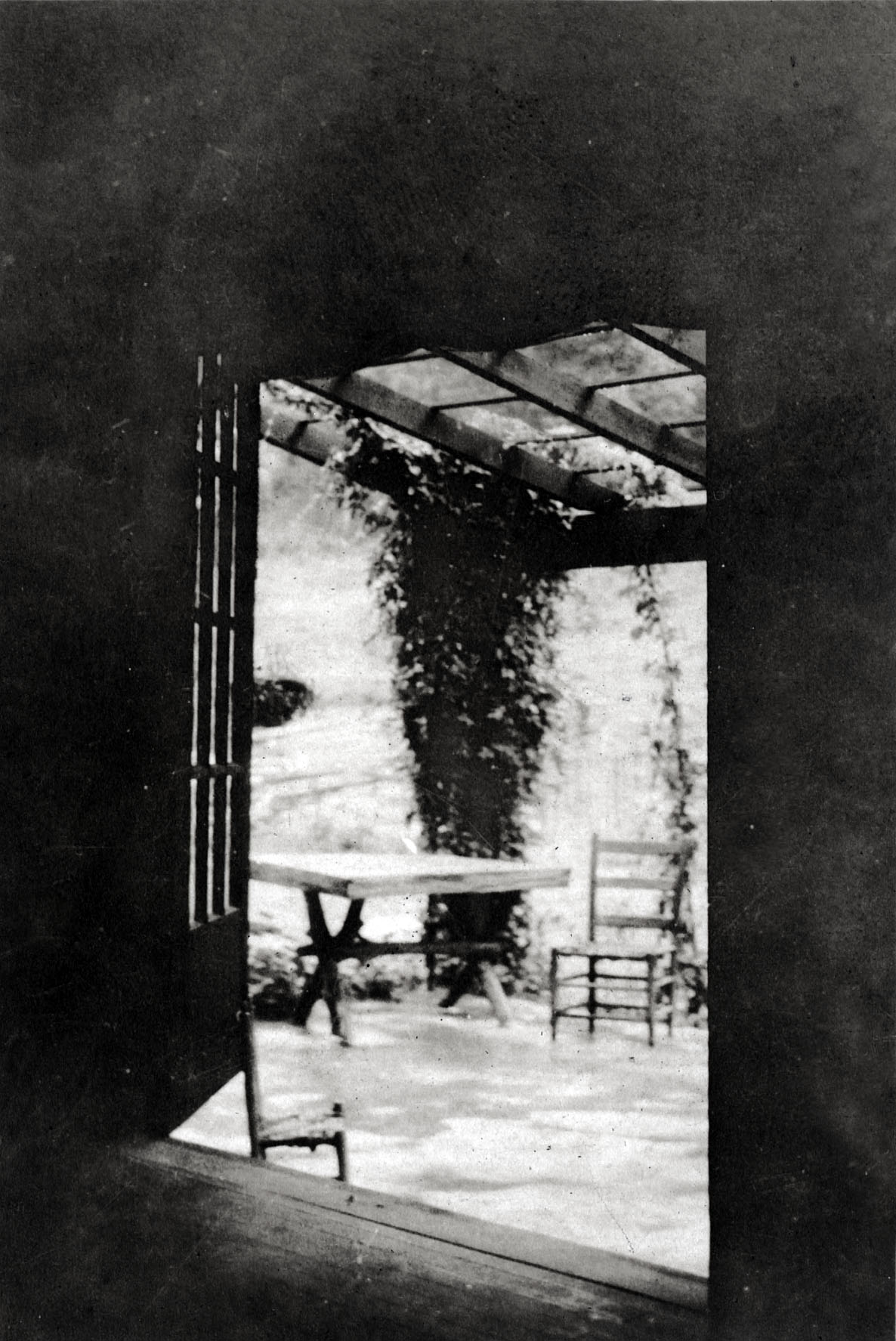 - 136 [Far House interior view of fire place]; [Terrace and arbor view out the door of Far House]; [Room in Far House (?) with rocker and bed]; Far House Terrace where Cecil Sharp saw Set Running for the first time