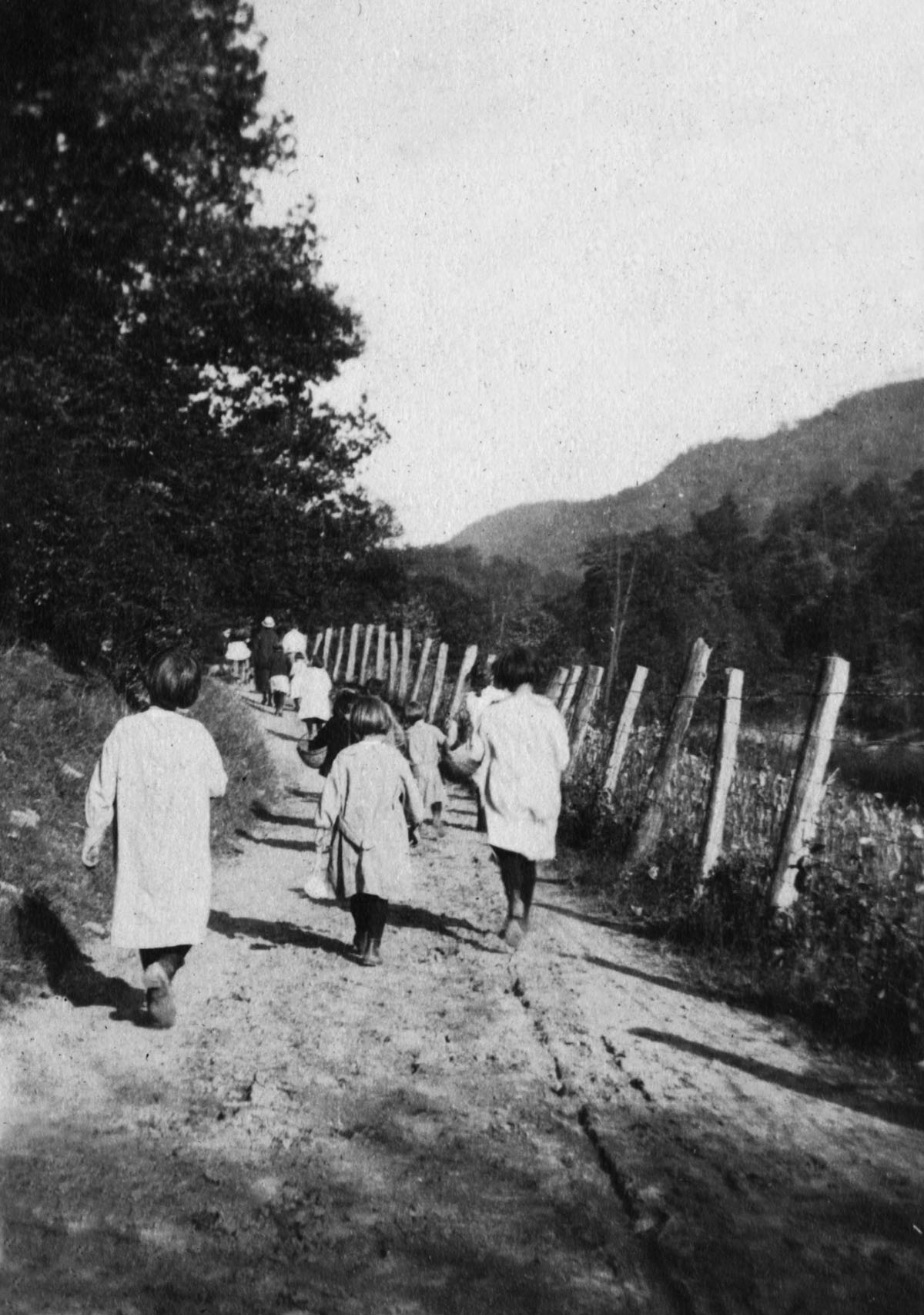- 130 [Old Log with tripod and iron pot and a group of three women on porch]; Children taking their milk and bread out for Sunday night supper; [Large group of adults and children hoeing field]; [View pf field with compost heaps and Office and infirmary on the hill behind]