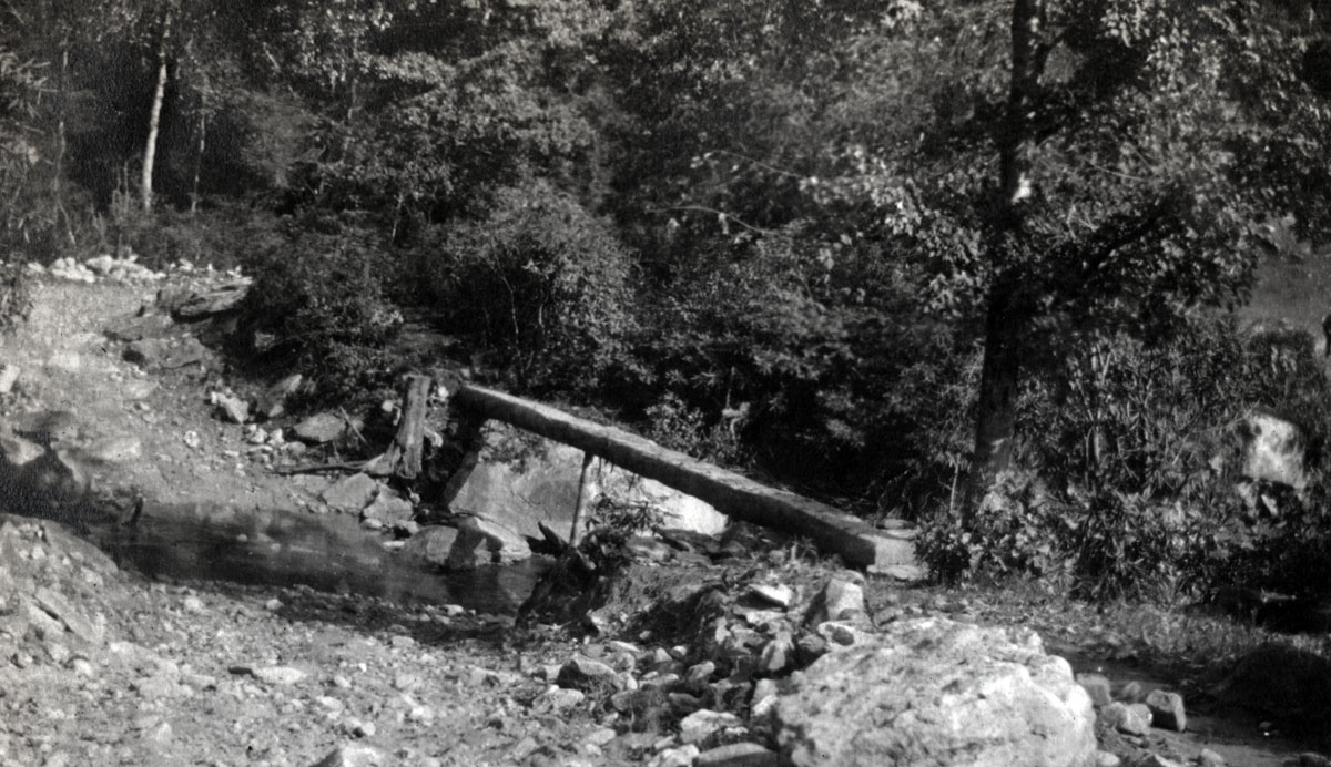- 141 Foot-log to Old Log; [Indian Rock and rail fence]; [Old Log, view with corn patch]; Fields and Old Log house view]