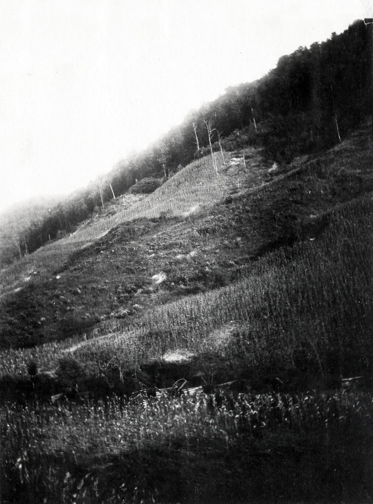 - 148 [Valley with corn fields and cabins]; [View of hillsides with large corn-fields (Deschamps Field ? at PMSS?)