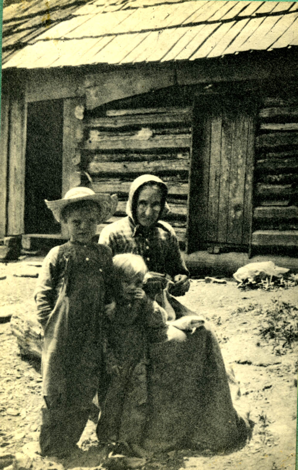 - Friends & Family: VI 37. Aunt Bet Scott seated in front of cabin with two boys on her right. [Vl_37_1185c]