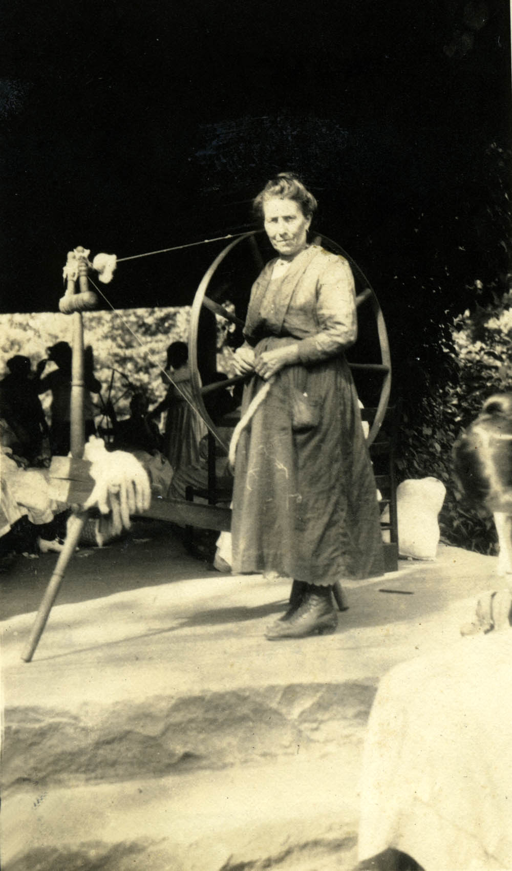 - Friends & Family: VI 37 Aunt Sal at spinning wheel in yard, view 1. [Vl_37_1200c]
