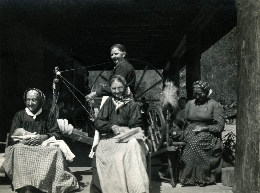 - Friends & Family: VI 37 Four women seated on the porch at Big Log. Women are carding and spinning. Woman to far left is holding a baby. [Vl_37_1192]