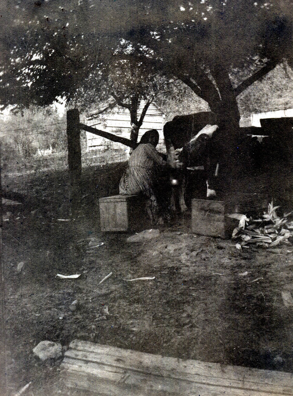 - Friends & Family: VI 37 Aunt Sal milking cow under a tree. [Vl_37_1196b]