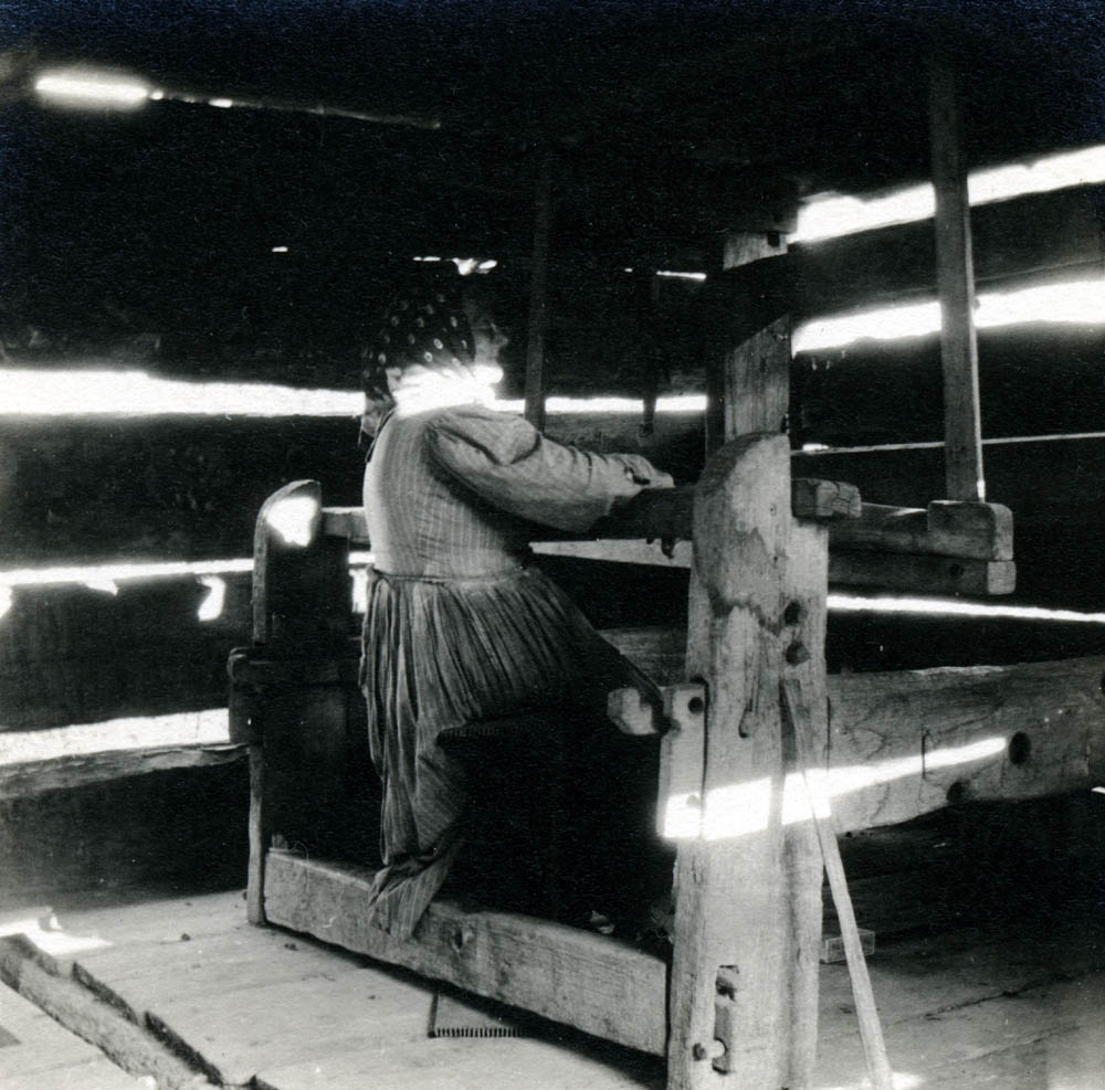 - Friends & Family: VI 37. Aunt Sal at the loom in the ‘Creech Cabin’, after move to PMSS campus and before chinking of the cabin. [Vl_37_1200]