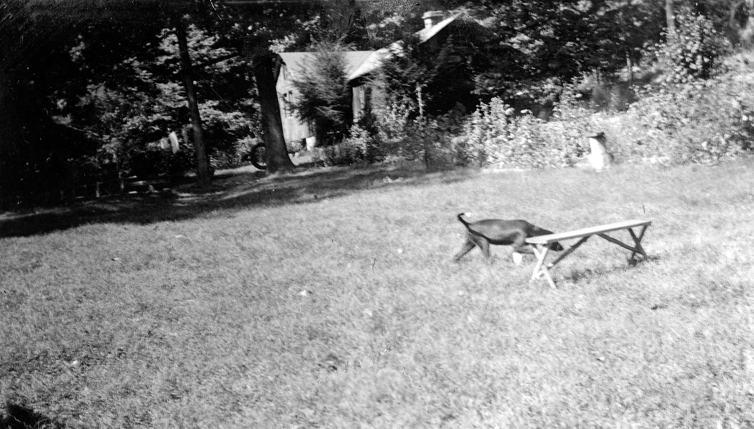 - Lutrella Baker Album. Line Fork Settlement, 1937-41. Cabin and Baker dog on lawn. line_fork_004c