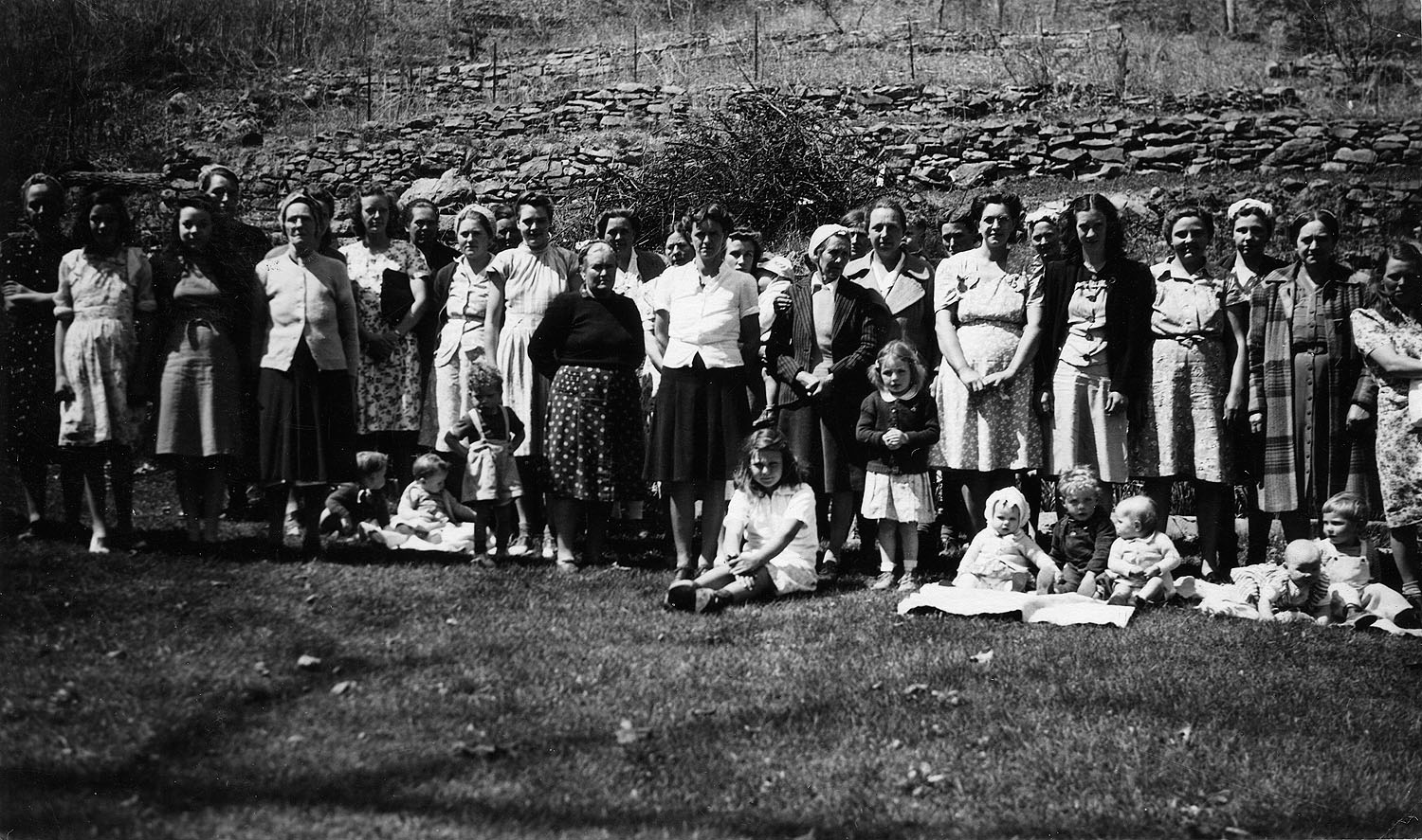 - Lutrella Baker Album. Line Fork Settlement, 1937-41. Group portrait of adults and some small children on lawn in front of terracing at Cabin. [line_fork_012a.jpg]