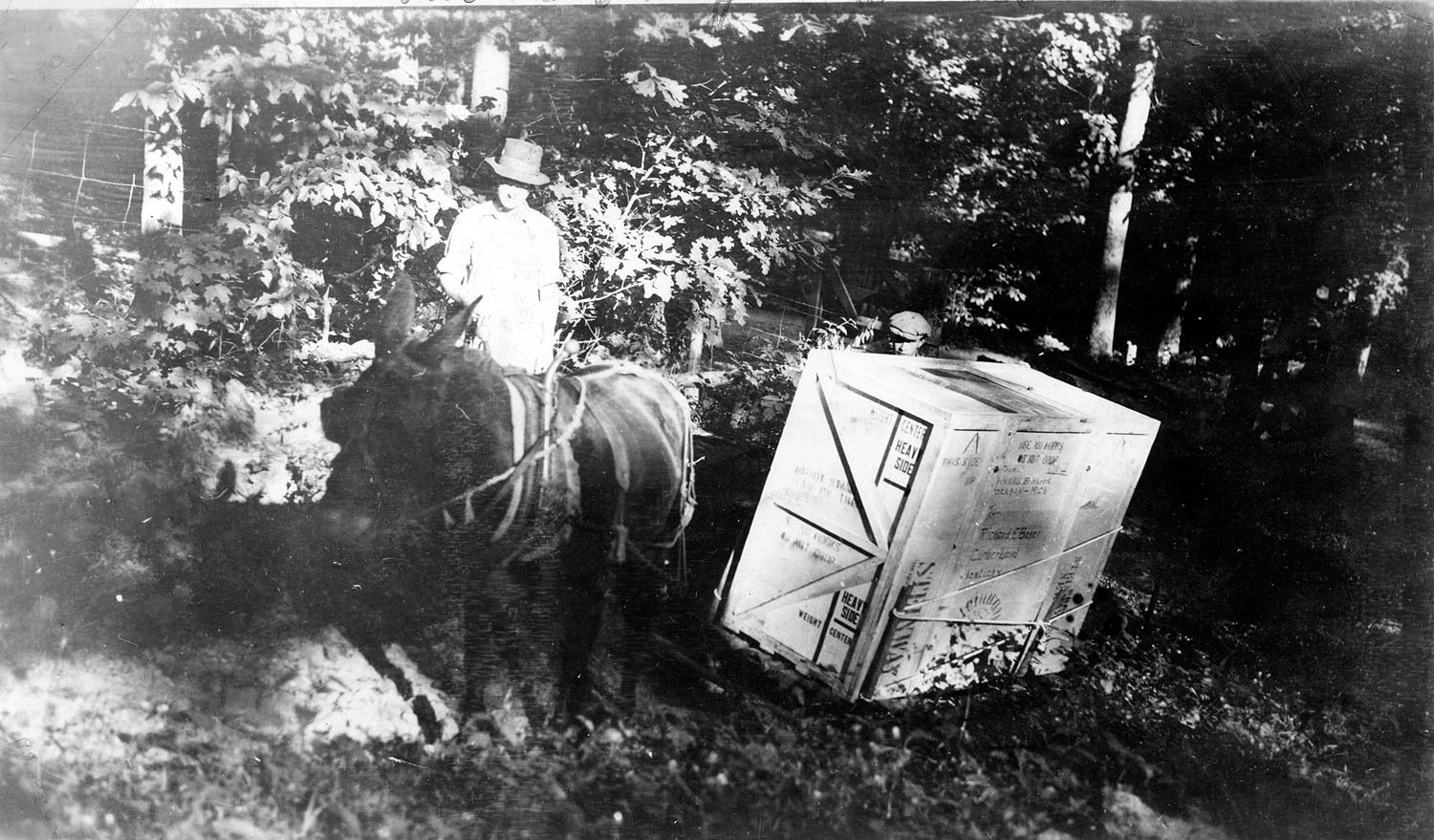 - Lutrella Baker Album. Line Fork Settlement, 1937-41. Lutrella [?] and mule with carrying sacks. [line_fork_012b.jpg]