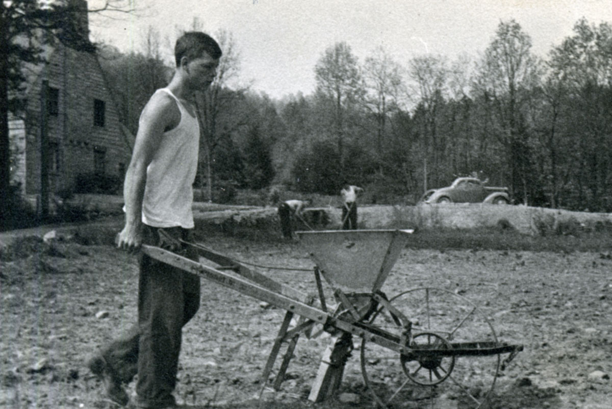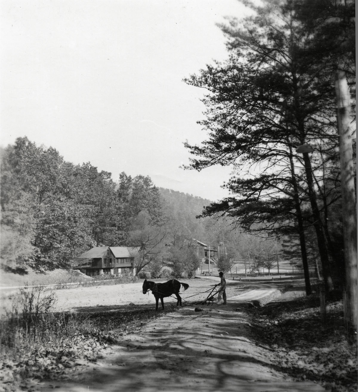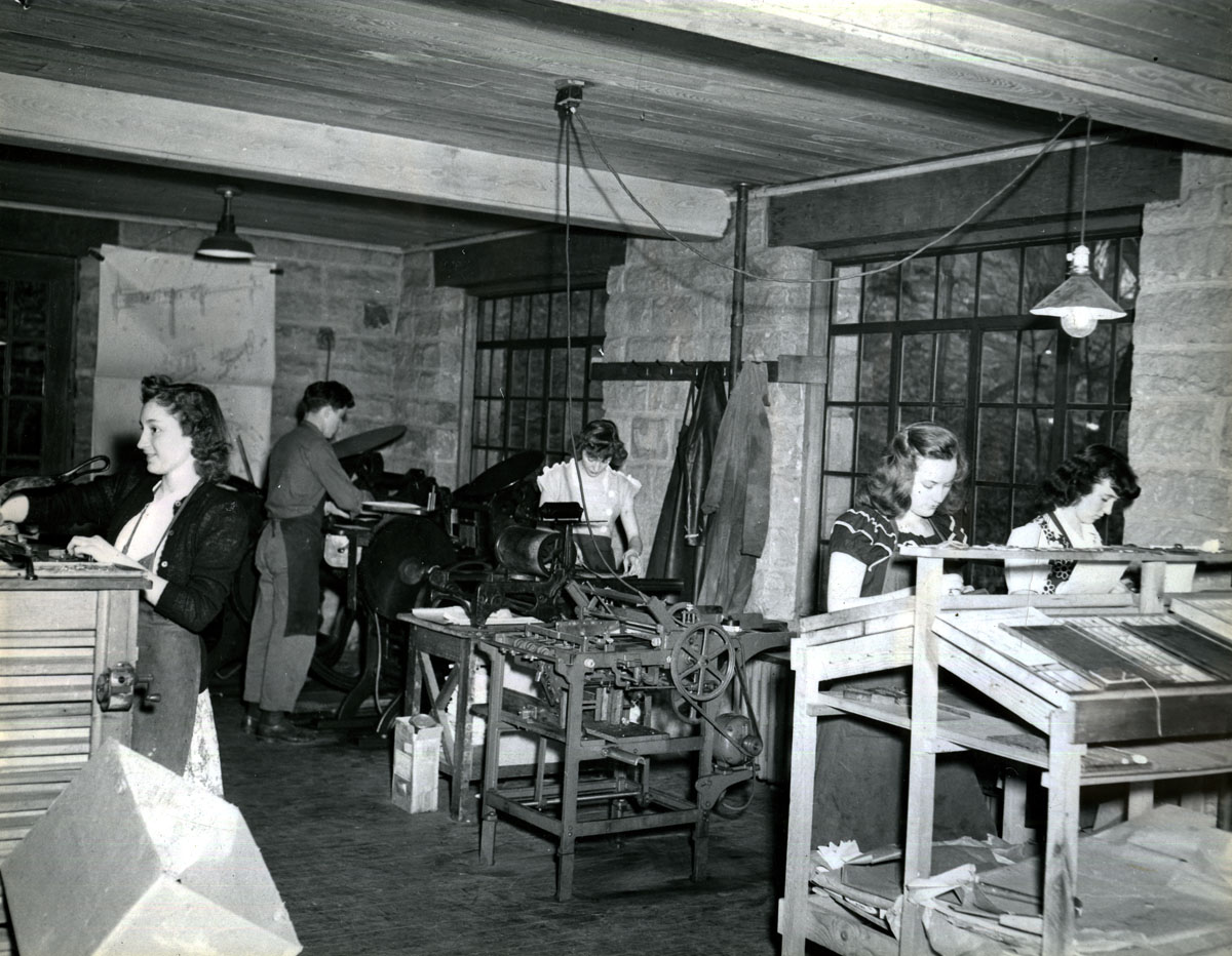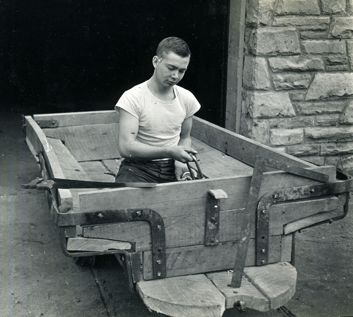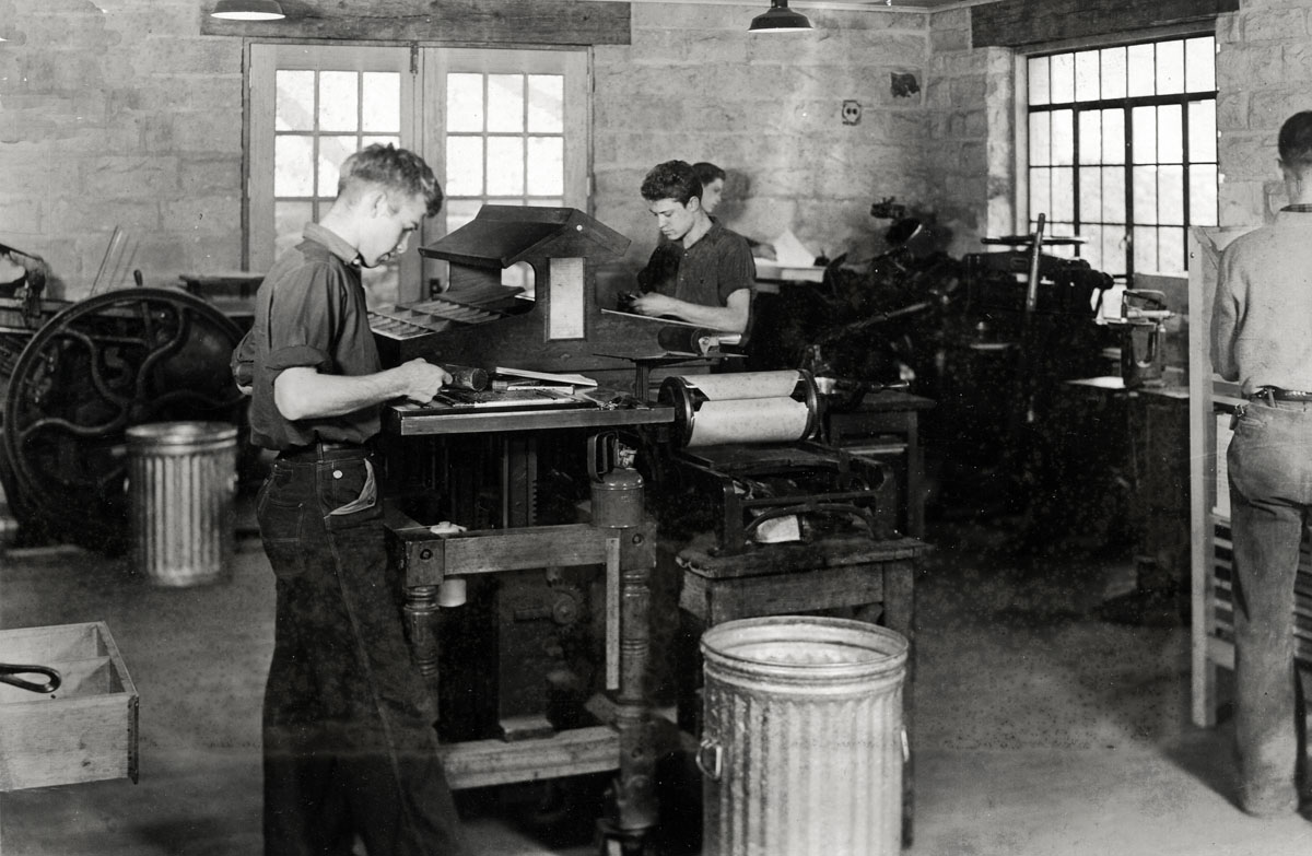 TAGS:  campus life; student work; labor; education; vocational education; ; lime kilns; limestone; Smoke House; Arthur Doane;  curing meat; farming; ploughing; horses; Ayrshire cows; milking; pigs; shoats; carpentry; art; painting; typing classes; print shop; Ruby Ayers;