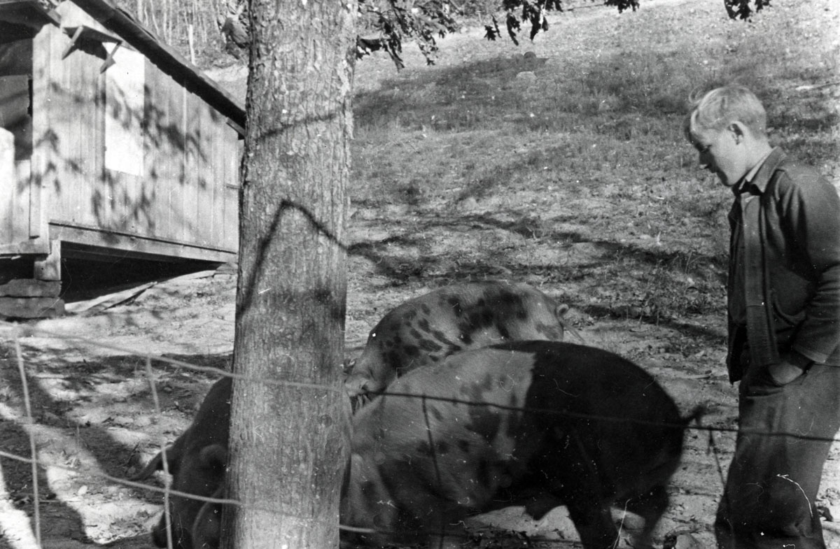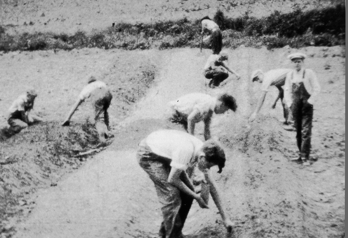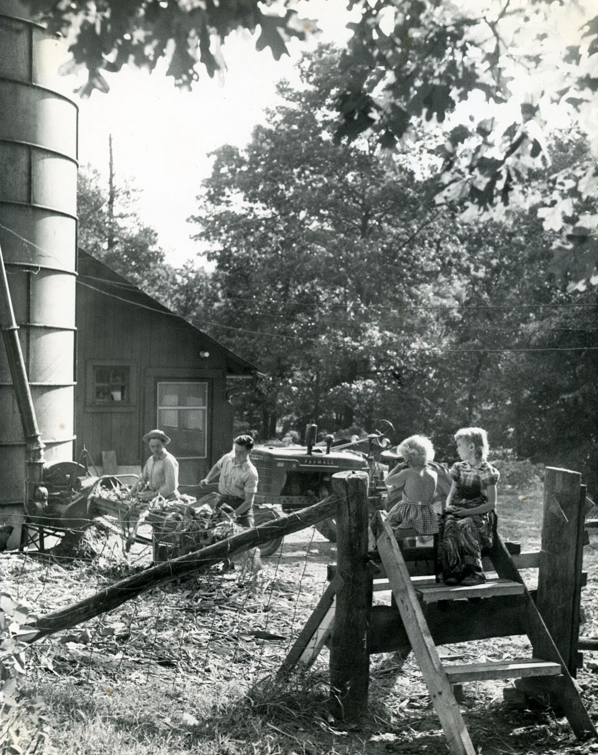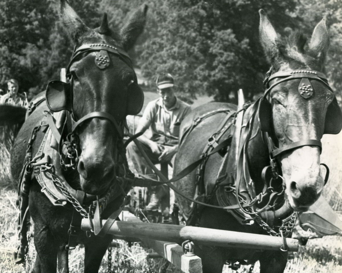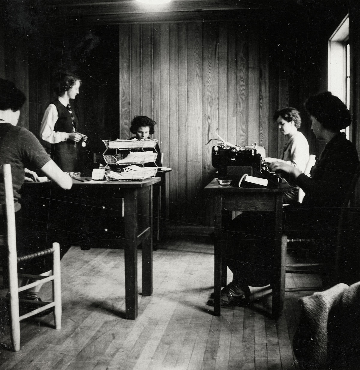 TAGS:  campus life; student work; labor; education; vocational education; ; lime kilns; limestone; Smoke House; Arthur Doane;  curing meat; farming; ploughing; horses; Ayrshire cows; milking; pigs; shoats; carpentry; art; painting; typing classes; print shop; Ruby Ayers;