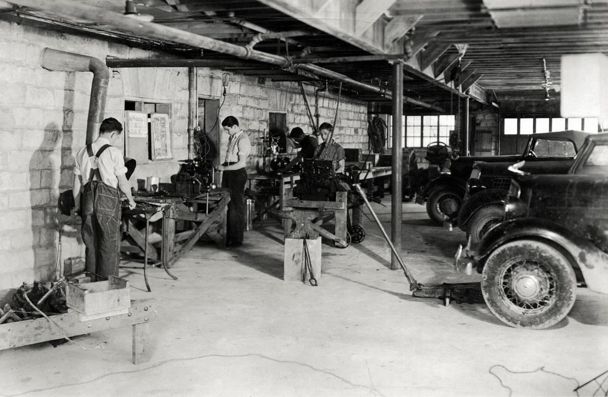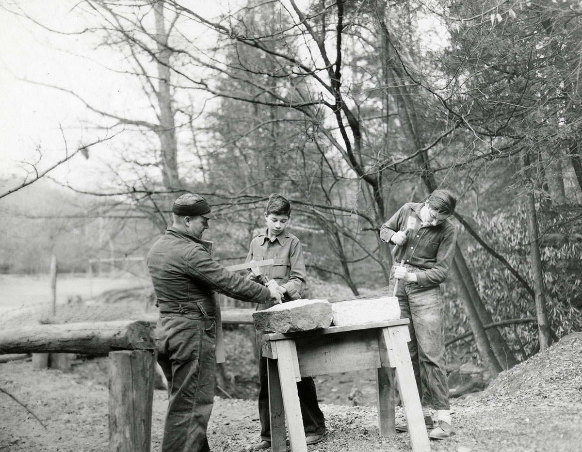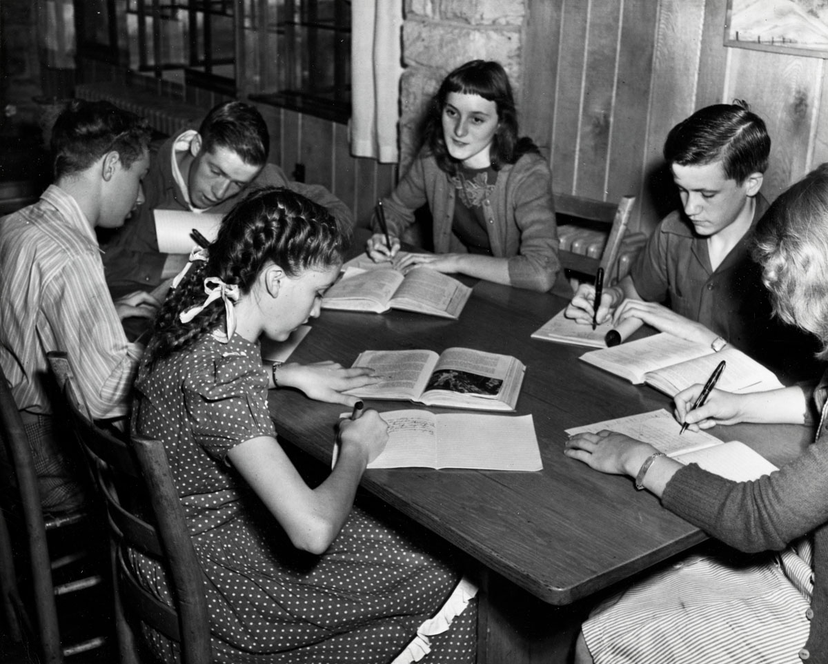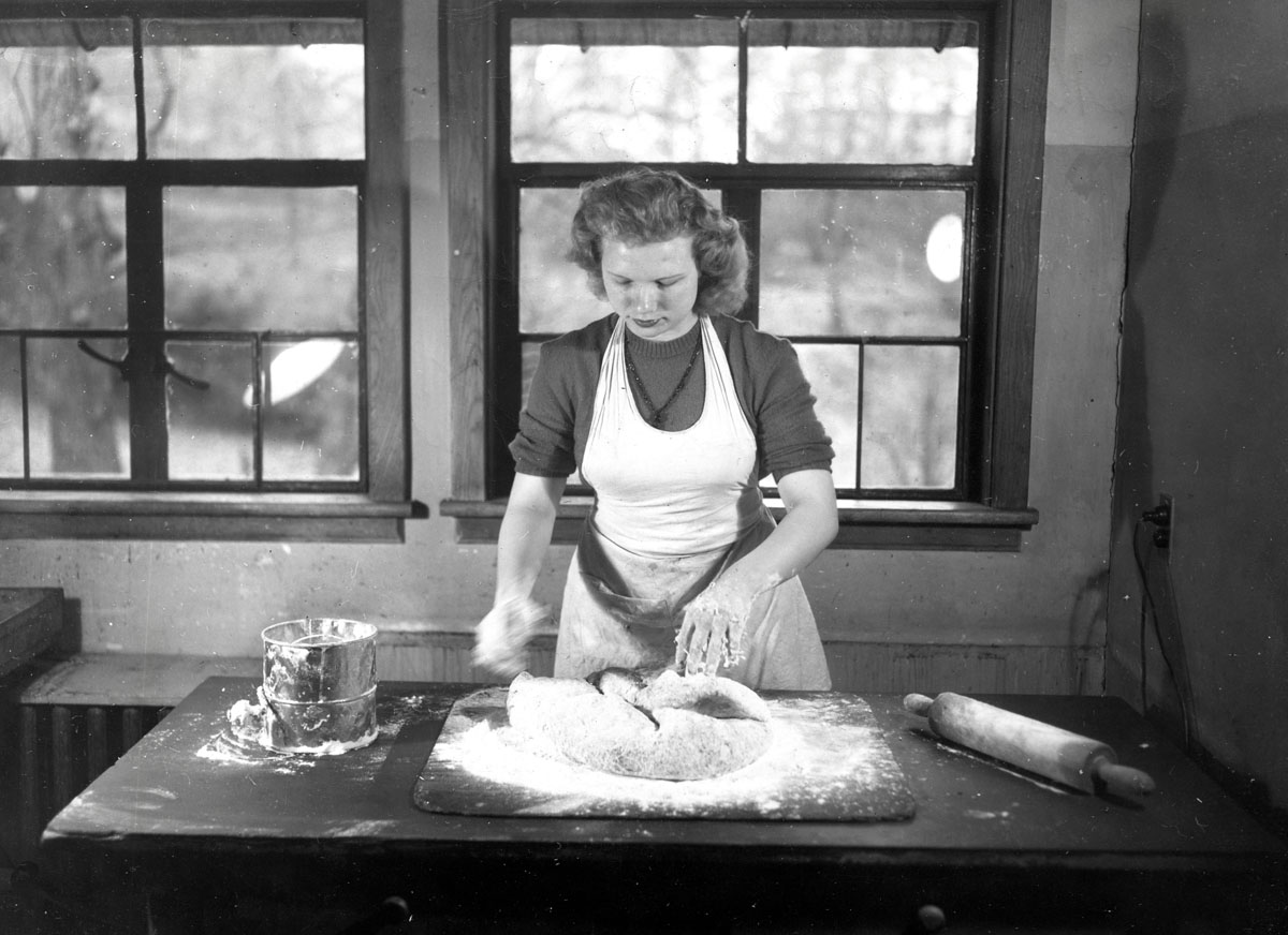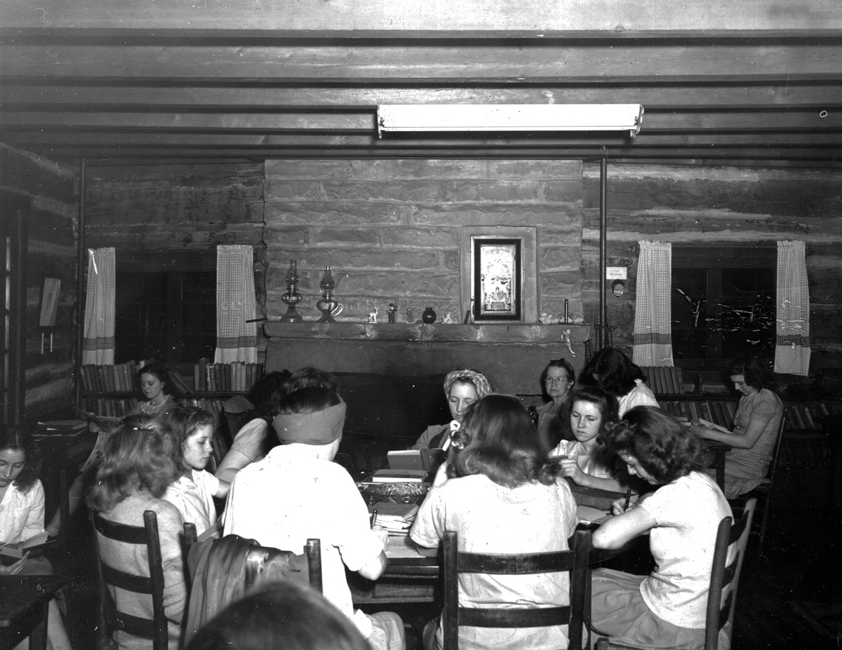 TAGS:  campus life; student work; labor; education; vocational education; ; lime kilns; limestone; Smoke House; Arthur Doane;  curing meat; farming; ploughing; horses; Ayrshire cows; milking; pigs; shoats; carpentry; art; painting; typing classes; print shop; Ruby Ayers;