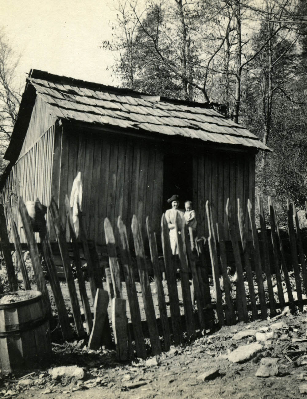 - Mallie Begley with young child in arms, standing in yard in front of doorway FN Vl_35_1127b