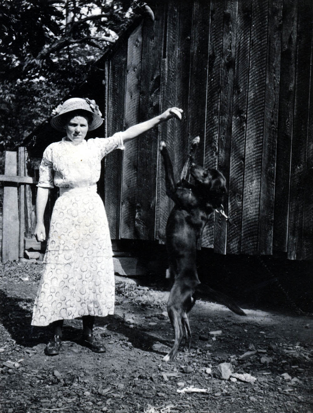 - Woman in hat, standing and holding out treat for dog who jumps to reach it. FN Vl_35_1128