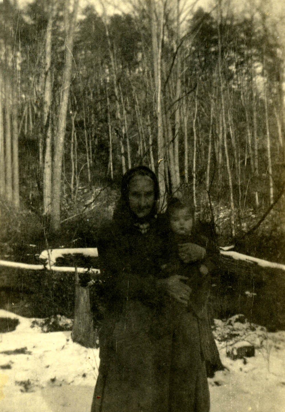 - Woman holding infant. Standing outside in the snow. FN Vl_35_1137d