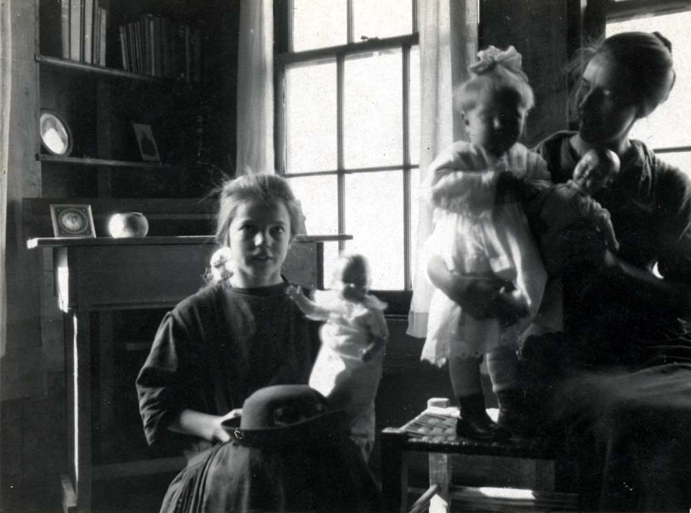 - Woman with young child and young girl to her right, holding a doll. Inside a PMSS house, worker [?] to far right. FN Vl_35_1150