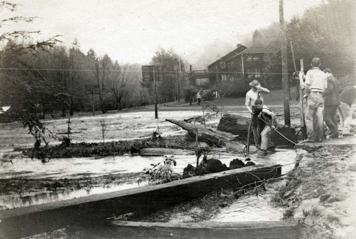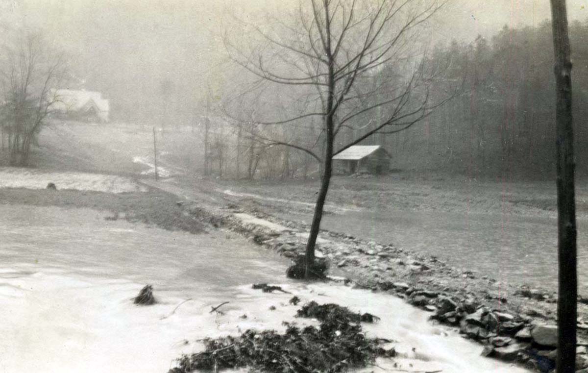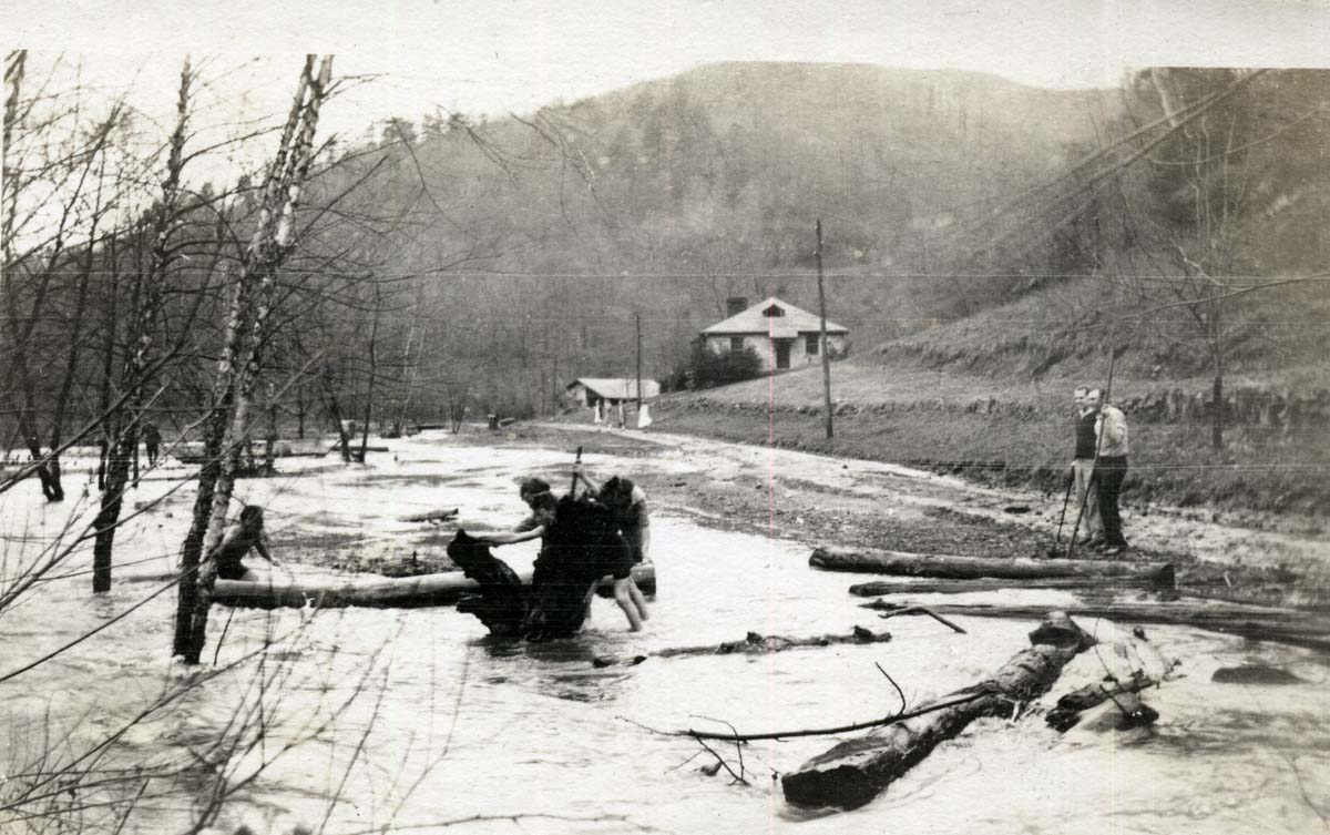 This is a composite file of photographs that chronicle several types of disasters that often rotate through the mountains of Eastern Kentucky. The flooding of the Pine Mountain Settlement School campus in 1929 and 1935; the various forest fires; the massive logging and the building of railroads and roads to transport logs, —- all strain the environment. Roads and railroads may seem a strange entry to the genre of disasters, but because the valley’s of Eastern Kentucky are so narrow, roads and railroads can be enormously disruptive to homes and farms. For example, the early narrow-gauge rail line built to carry timber from the surrounding forest was very disruptive to the early School. It once cut through the center of the campus in the early nineteen-teens and early nineteen-twenties. In the coal-mining regions of Harlan county, rail lines could be found throughout narrow hollows and along the county’s rivers and often mere feet from the front porch of homes.