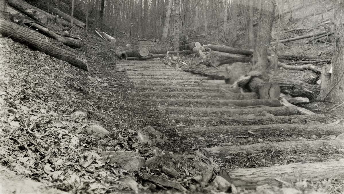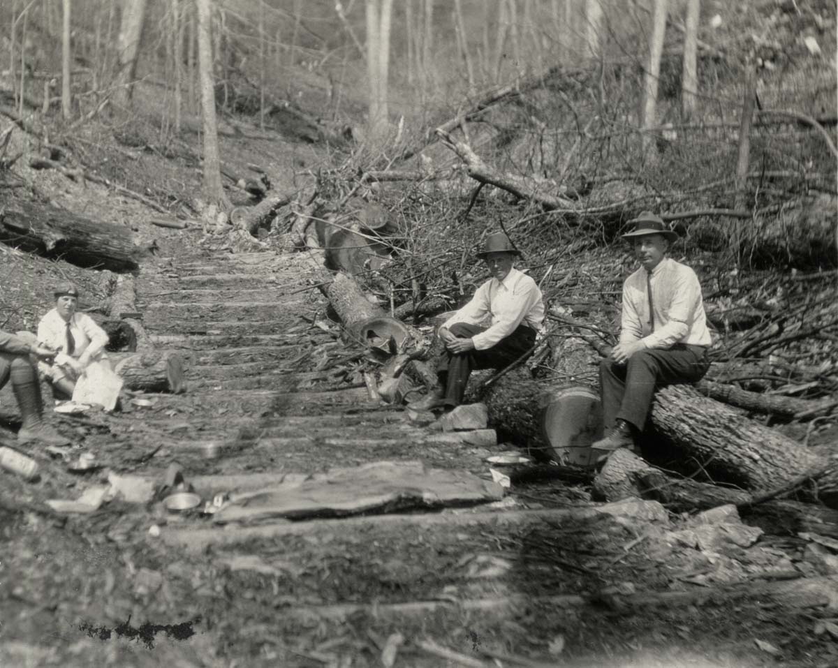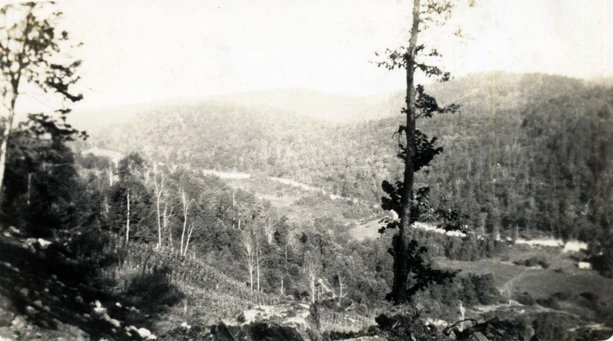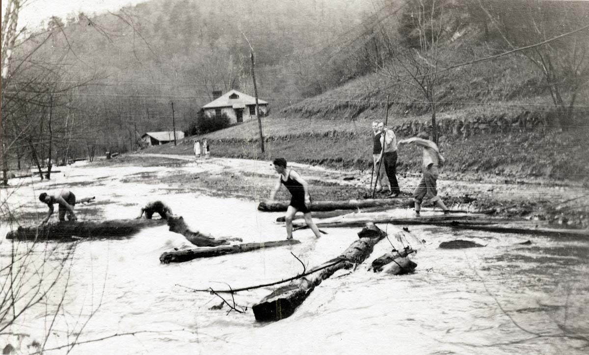 This is a composite file of photographs that chronicle several types of disasters that often rotate through the mountains of Eastern Kentucky. The flooding of the Pine Mountain Settlement School campus in 1929 and 1935; the various forest fires; the massive logging and the building of railroads and roads to transport logs, —- all strain the environment. Roads and railroads may seem a strange entry to the genre of disasters, but because the valley’s of Eastern Kentucky are so narrow, roads and railroads can be enormously disruptive to homes and farms. For example, the early narrow-gauge rail line built to carry timber from the surrounding forest was very disruptive to the early School. It once cut through the center of the campus in the early nineteen-teens and early nineteen-twenties. In the coal-mining regions of Harlan county, rail lines could be found throughout narrow hollows and along the county’s rivers and often mere feet from the front porch of homes.