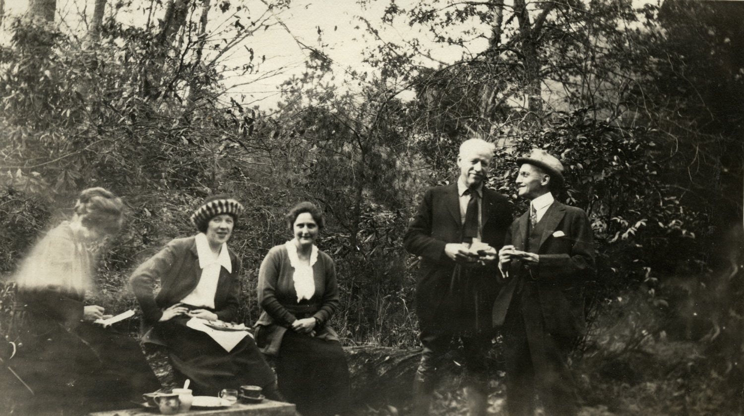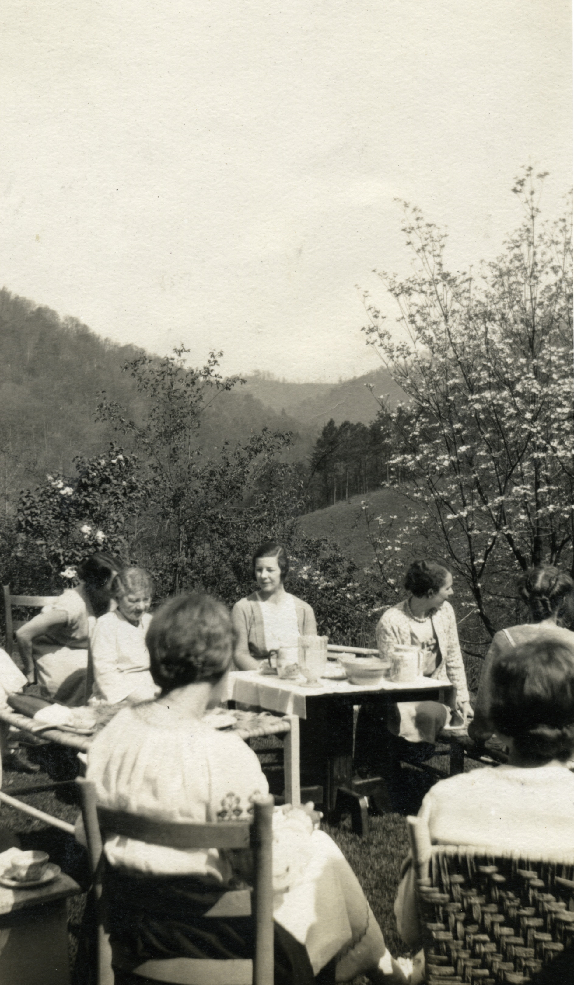 - Tea on the lawn at Zande House [Dogwood Breakfast ?] , 1930. (l. to r.) Sally Loomis, a visitor Miss Taylor, Dr. Alfreda Withington, Miss Burbrick, Mrs. Burns, Miss Melville, Mrs. Barti…, Miss McDavid, Mrs. Bo… [X_100_workers_2541.jpg]