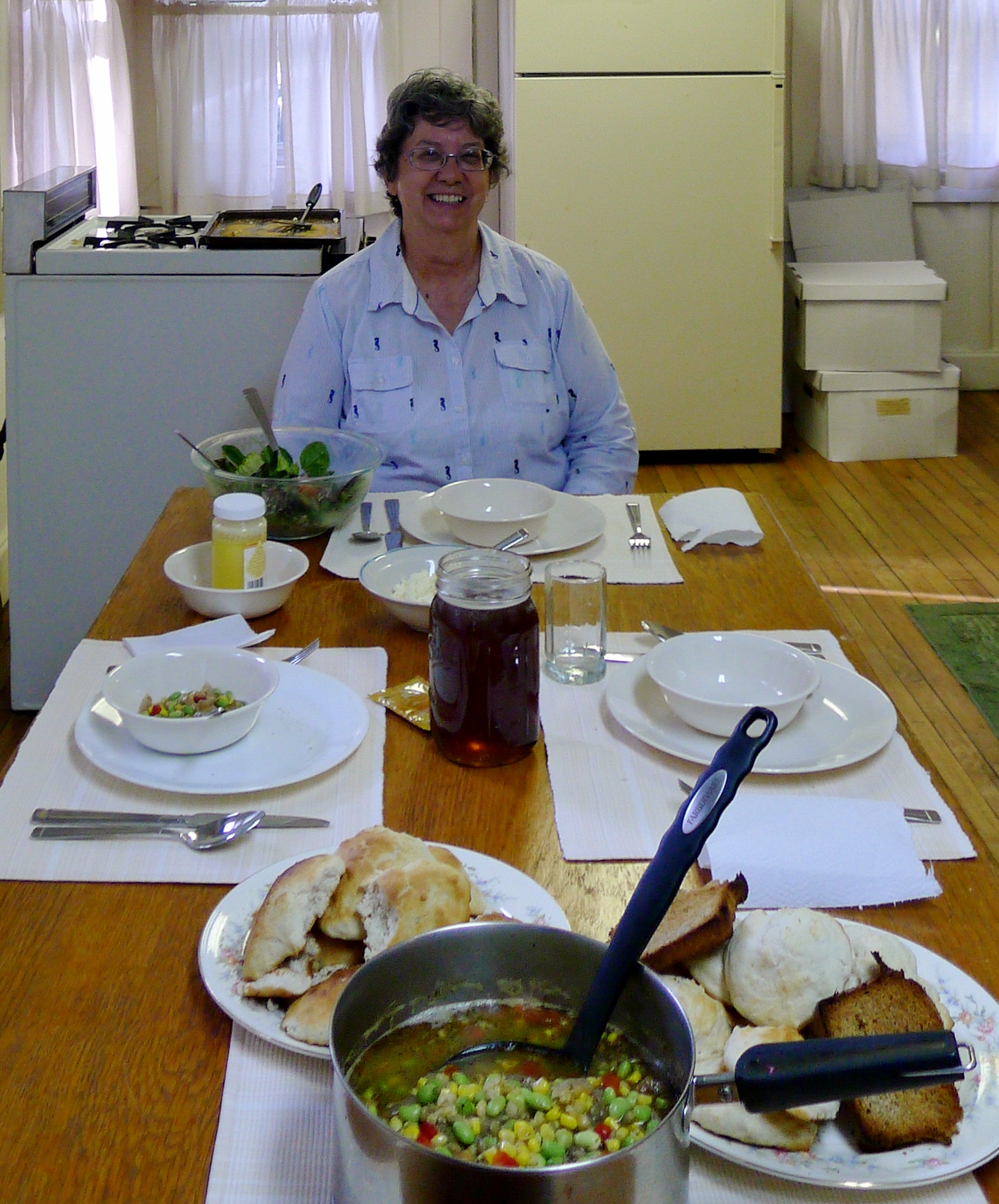 - Anna Cummins Smith, community volunteer Librarian who assisted in preparation and follow-up for the two Alpha Sigma Tau work on the PMSS Collections. It’s dinner time at Hill House, 2015. Photo by AAE.