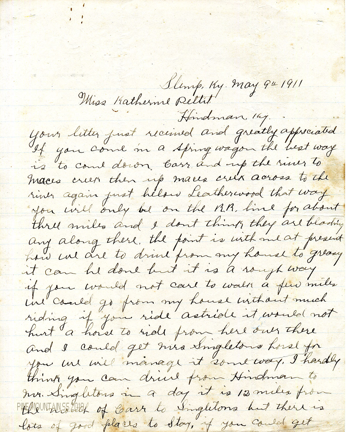KATHERINE PETTIT CORRESPONDENCE 1911 My Dear Friend Letter, May 27, 1911 This letter, dated May 27, 1911 and written by Katherine Pettit, recounts a visit by Pettit, Rev. Lyttle, PMSS nurse Harriet Butler and Stephen Guilford (a former Hindman student) through four Eastern Kentucky counties to view a site at Pine Mountain that was proposed by Rev. Lyttle for a new school and for Pettit to visit homes that wove “coverlids” — Pettit’s strong interest.