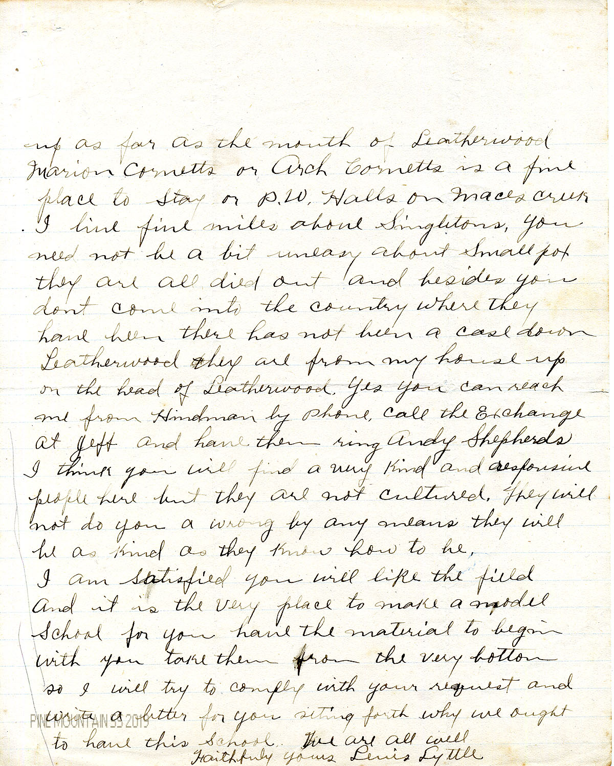 “I think there is a good place here where Greasy, Middle Fork, Line Fork, Straight Creek, Leatherwood, and Cutshin, all head in against the Pine Mountain. Pure air, pure water, and plenty of children to enjoy it.”