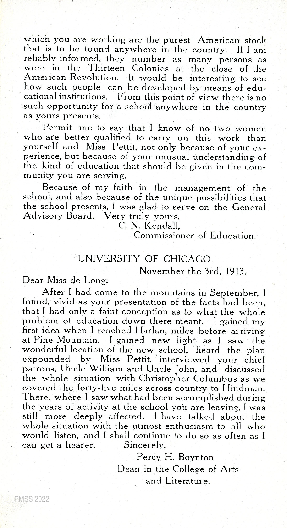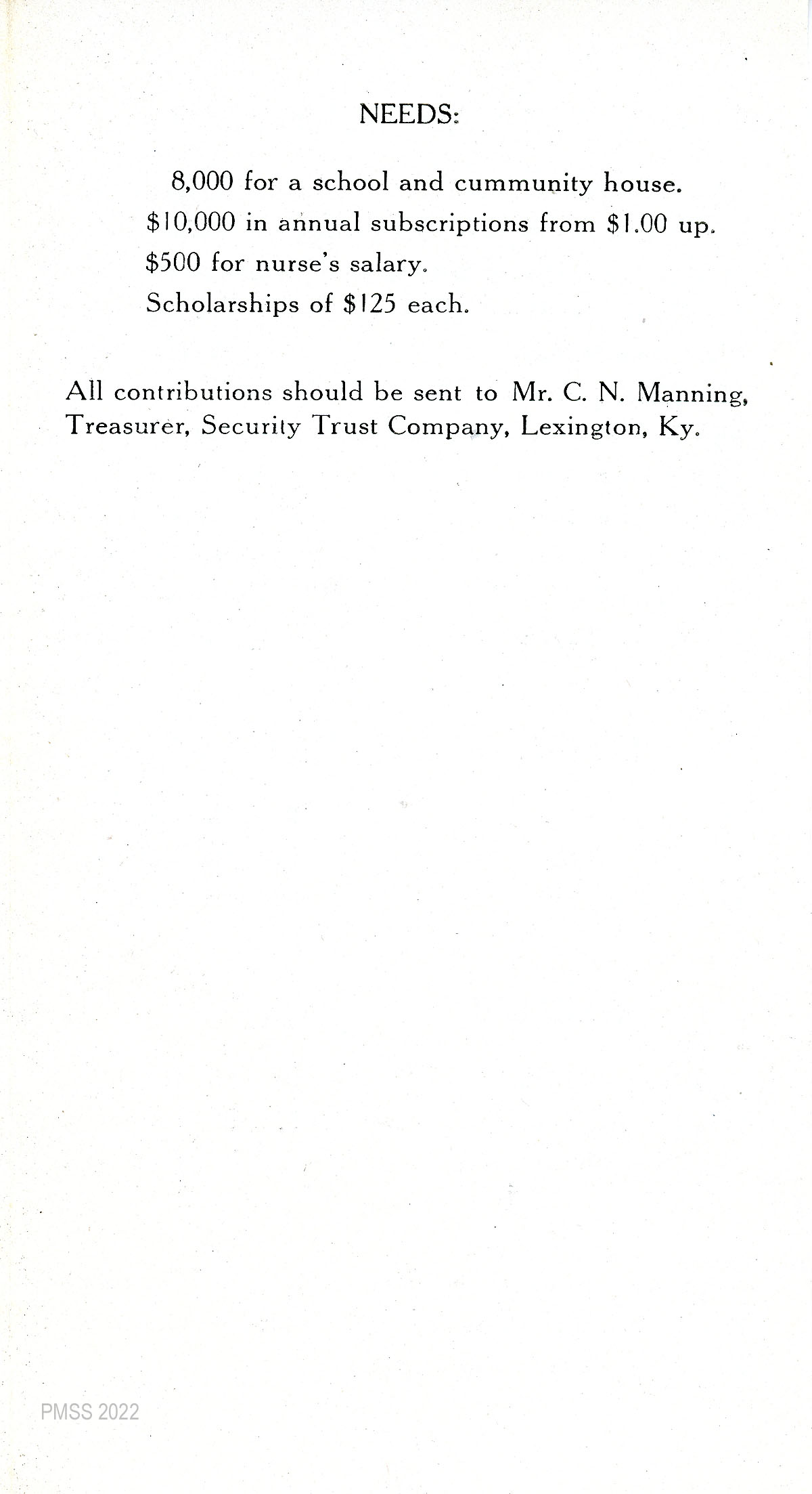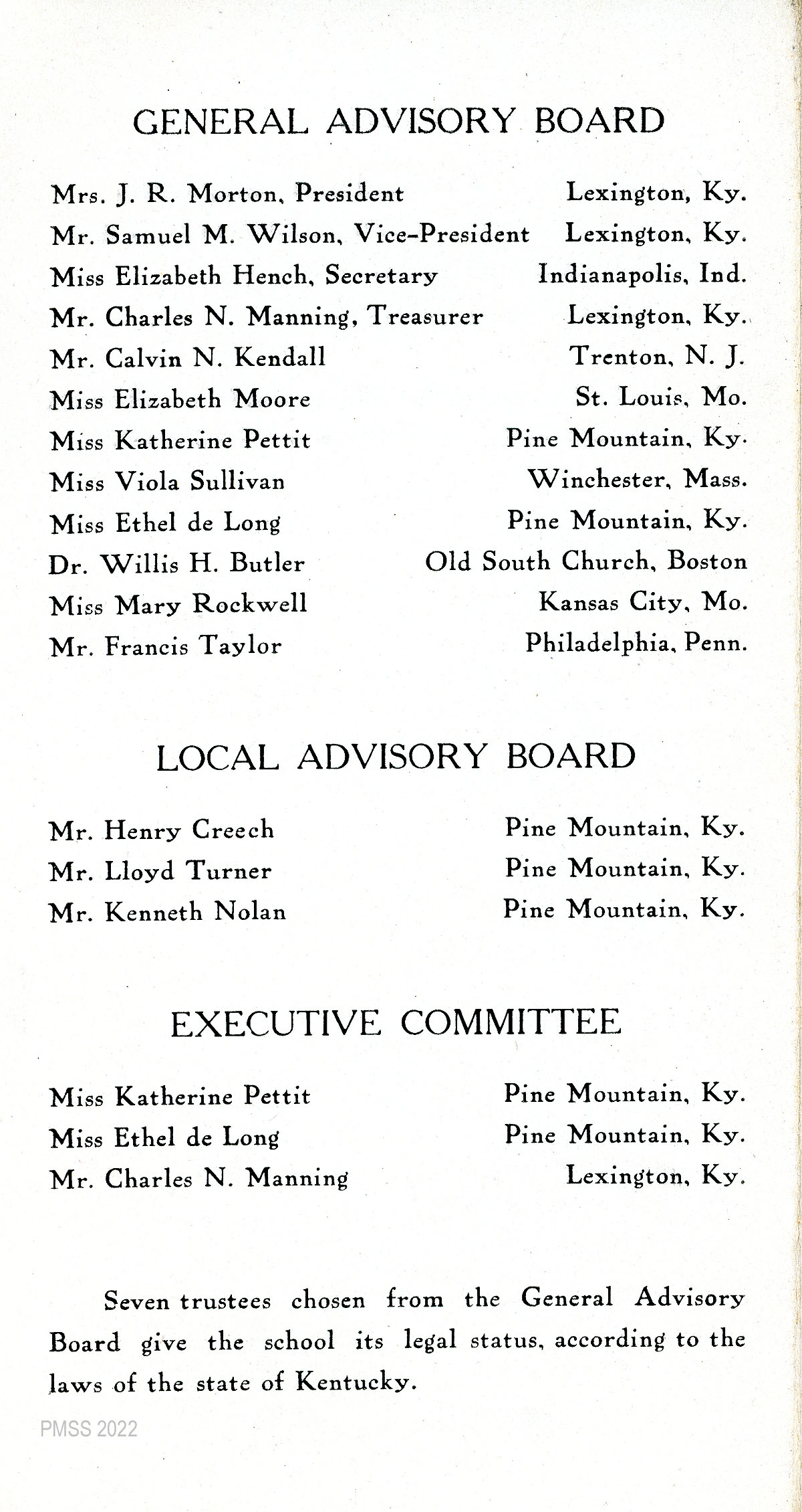 TAGS: PMSS ephemera, donor appeals, Board of Trustees, logging, endorsements, governance, General Advisory Board, Katherine Pettit, Mrs. J.R. Morton, Local Advisory Board, Executive Committee, Calvin Noyes Kendall, Percy H. Boynton