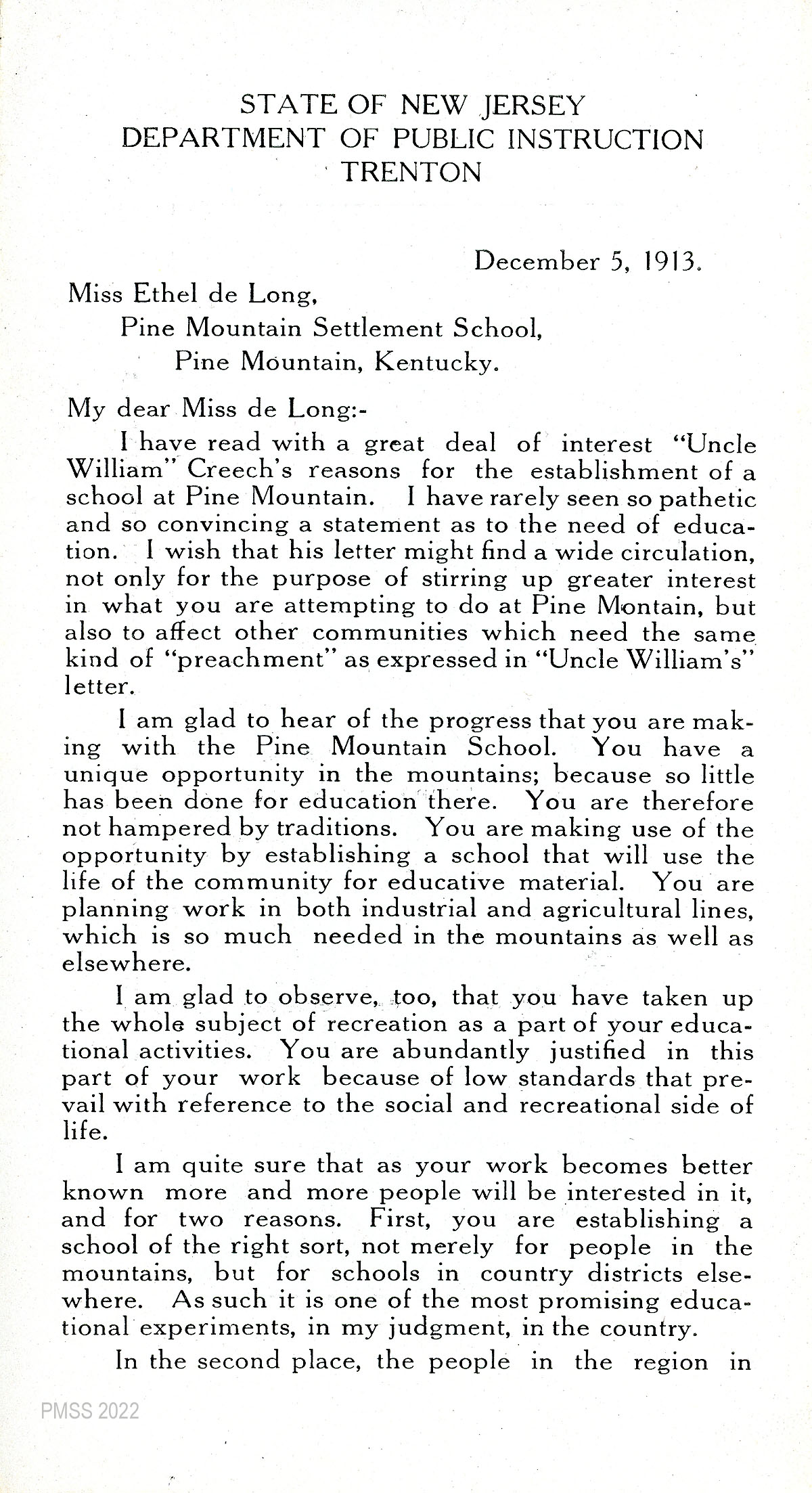 I have read with a great deal of interest “Uncle William” Creech’s reasons for the establishment of a school at Pine Mountain. I have rarely seen so pathetic and so convincing a statement as to the need of education. I wish that his letter might find a wide circulation not only for the purpose of stirring up greater interest in what you are attempting to do at Pine Mountain but also to affect other communities which need the same kind of “preachment” as expressed in “Uncle William’s” letter.