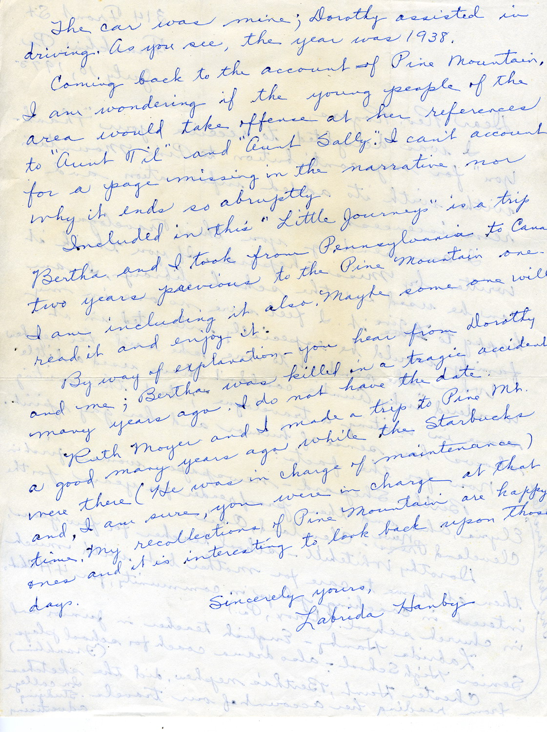 The following letter, sent to Burton Rogers, Director of Pine Mountain Settlement School, in 1973 by Labrida Hanby at the time the journal was donated to Pine Mountain, describes the women and their journey. Labrida Hanby wrote, “I am happy to give it [ the journal]. I feel sure no one in my family would be especially interested in it.”