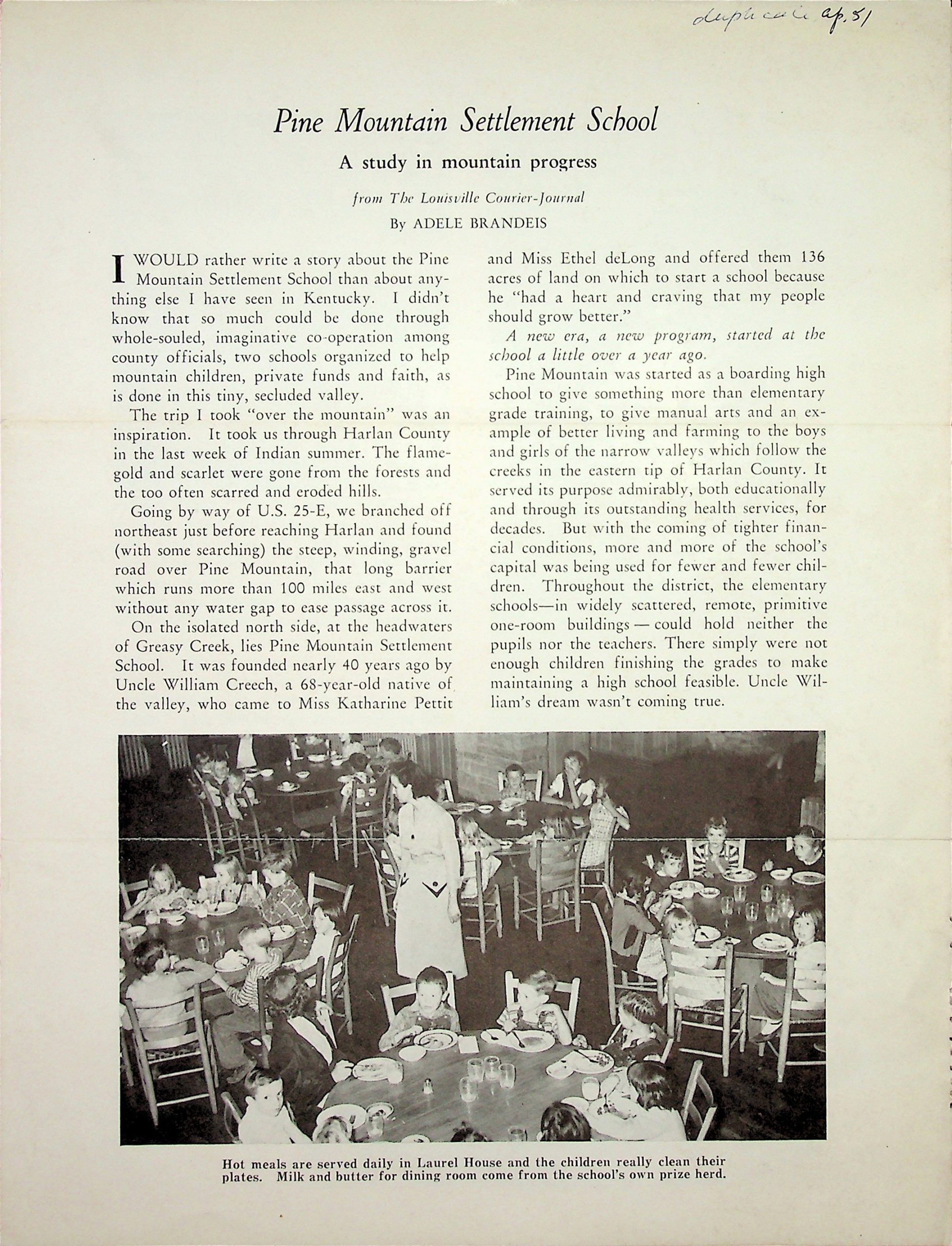 Adele Brandeis Article, Pine Mountain Settlement School, in The Louisville Courier-Journal, 1951, page 1. [1951AdeleBrandeisArticleLouisvilleCourier-Journal-scaled.jpg] *Reprint with permission.
