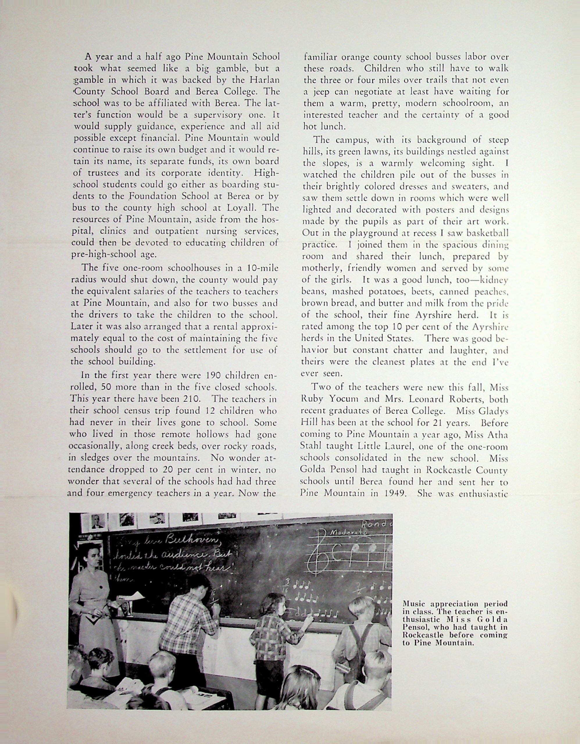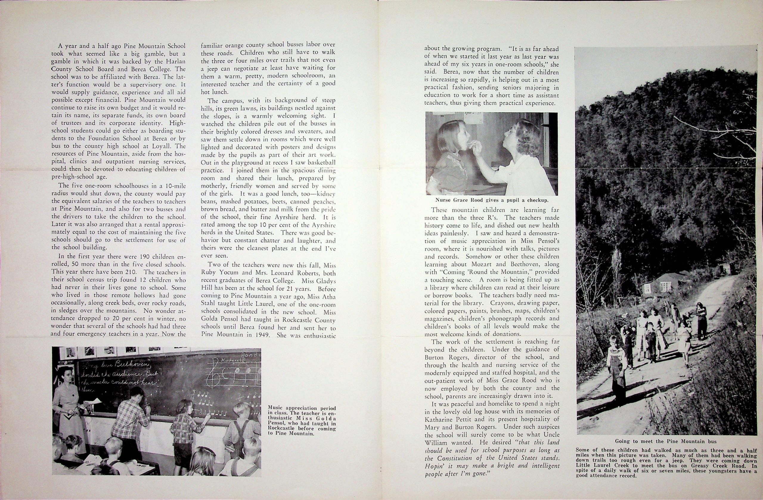 “High-school students could go either as boarding students to the Foundation School at Berea or by bus to the county high school at Loyall. The resources of Pine Mountain, aside from the hospital, clinics and outpatient nursing services, could then be devoted to educating children of the pre-high-school age.