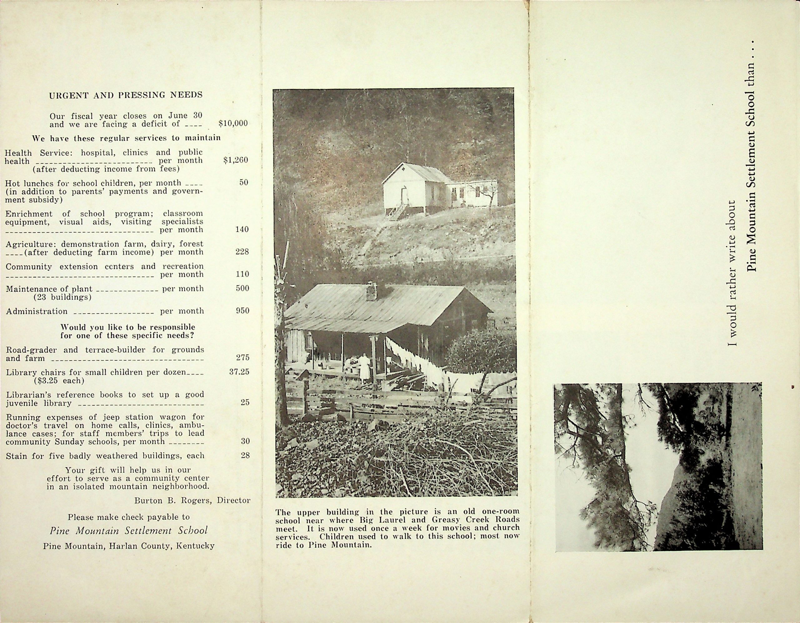 TAGS: Adele Brandeis, Pine Mountain Settlement School history and progress, article from The Louisville-Courier-Journal, fundraising brochure, Harlan County School Board, Berea College, Golda Pensol, teachers, Grace Rood, Mary and Burton Rogers, one-room schoolhouses, consolidated elementary school, list of school needs