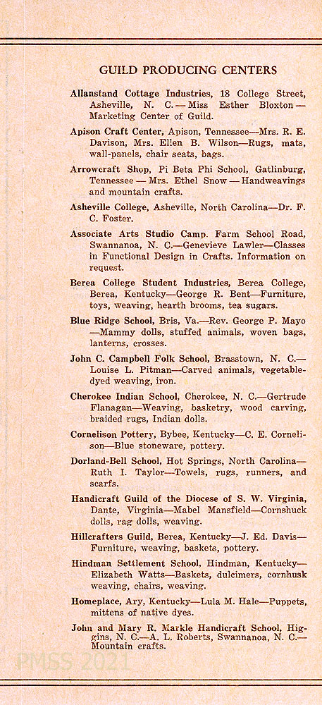 2. THE GUILD OFFICE at Berea, KY, describes how to contact them for information, including the Guild Shop at Asheville. “We can lay out an auto trip starting from Berea to various Producing Centers for visitors.”