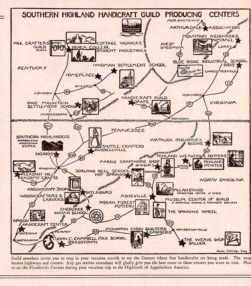 [003] A map of highways in Kentucky, Virginia, Tennessee, and North Carolina with the locations of the Southern Highland Handicraft Guild Producing Centers. [The map was drawn by June Coolidge Cary]. A paragraph invites readers to “stop in your vacation travels to see the Centers where fine handicrafts are  being made. … Any gas station attendant will gladly give you the best route…”