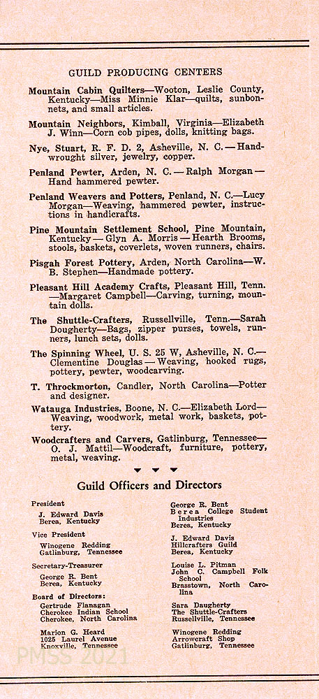 TAGS: Southern Highlands Craft Guild, brochures, Guild members, craft producing centers, handicrafts, artists, Helen Dingman, Fireside Industries, Tryon Toy Makers, ephemera, rural settlement schools, weaving, woodcarving, toys, baskets, craft guilds, Appalachian crafts, woodworking, brooms,