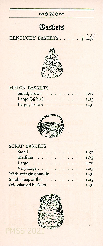 [002] “BASKETS”: List and images of 3 styles of baskets – Kentucky Baskets, Melon Baskets, Scrap Baskets — each with a list of available types and prices.