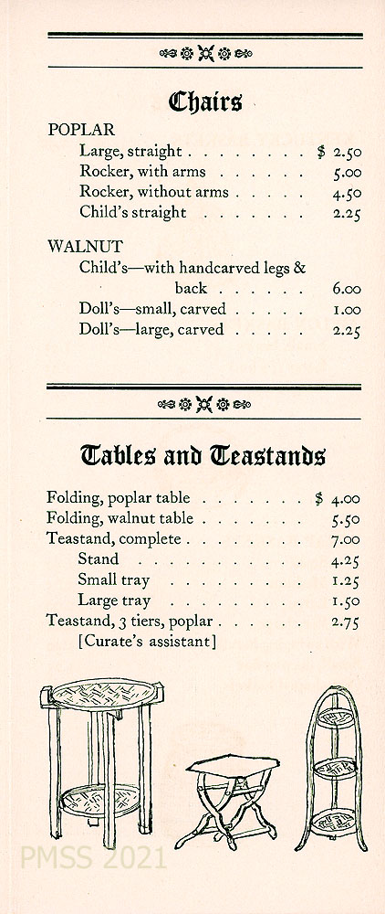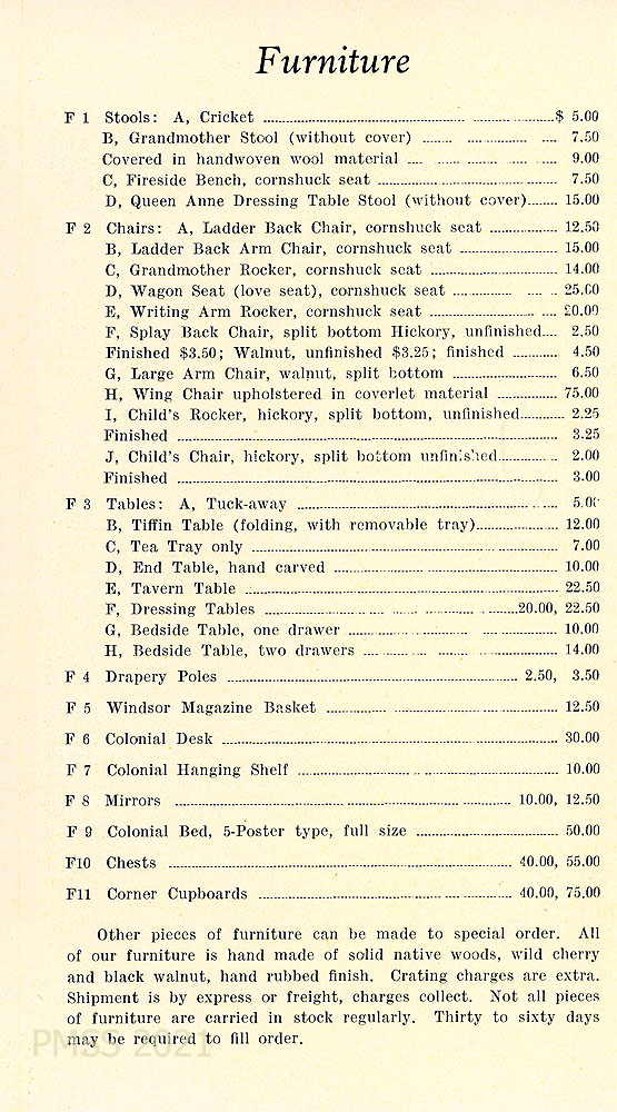 [004] “FURNITURE” price list, including a variety of stools, chairs, and tables. Also, drapery poles, Windsor Magazine basket, colonial desk, colonial hanging shelf, mirrors, colonial bed, chests corner cupboards. “Other pieces of furniture can be made to special order. All of our furniture is hand-made of solid native woods, wild cherry, and black walnut, hand-rubbed finish.”