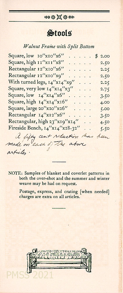 [004] “STOOLS – Walnut Frame with Split Bottom”: List of shapes, sizes and prices. Handwritten notation at bottom of the list: “A fifty cent reduction has been made on each of the above articles.