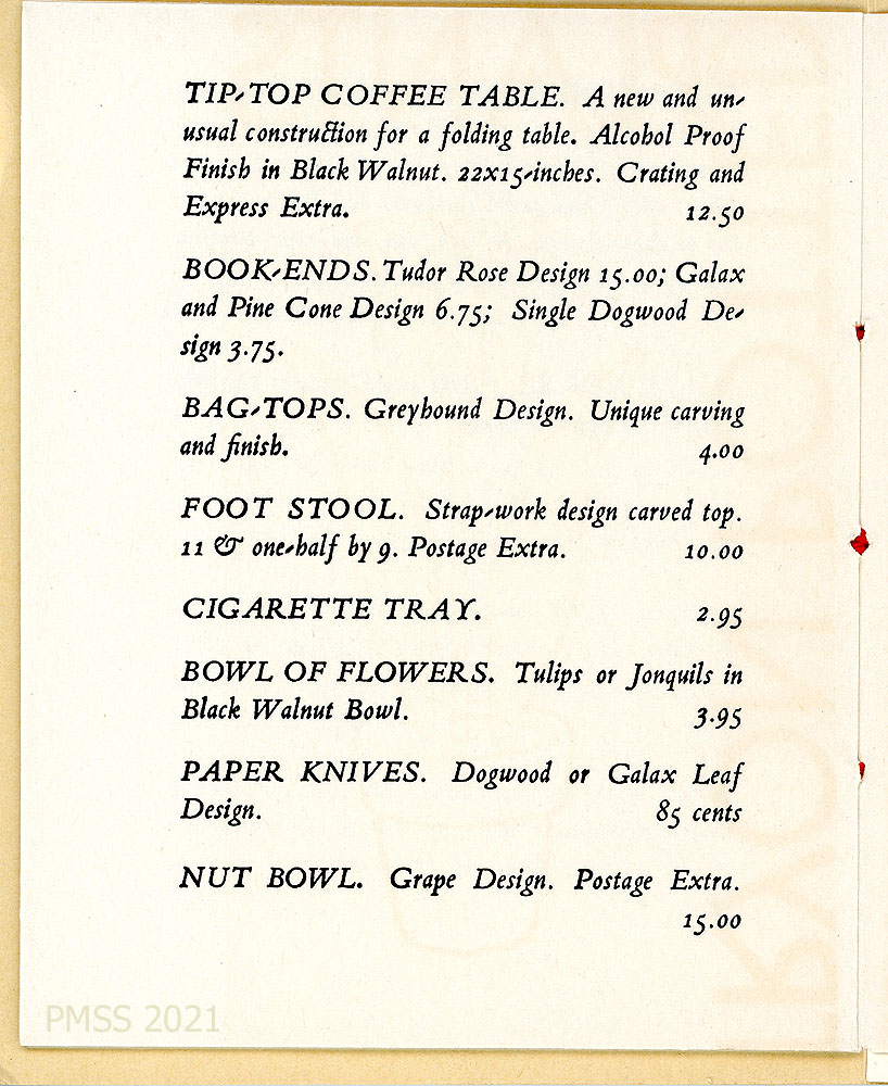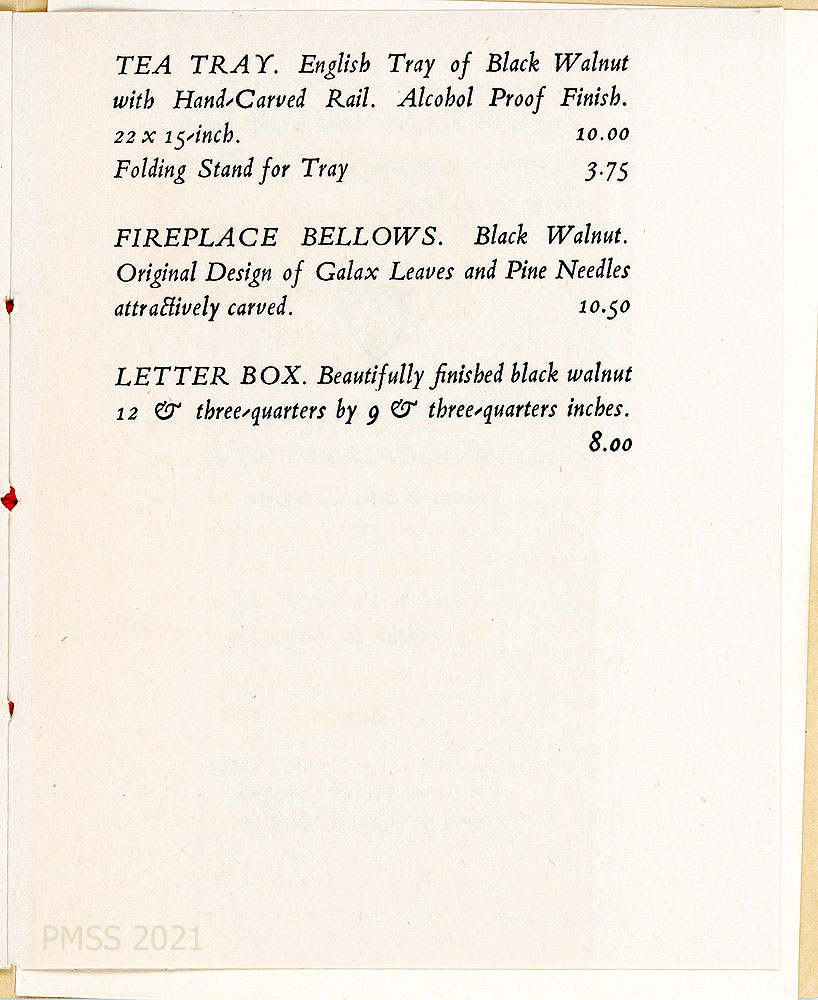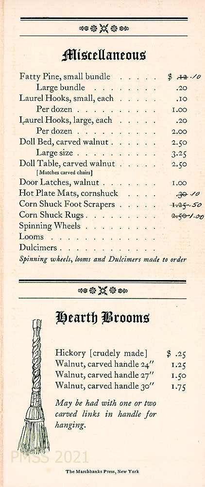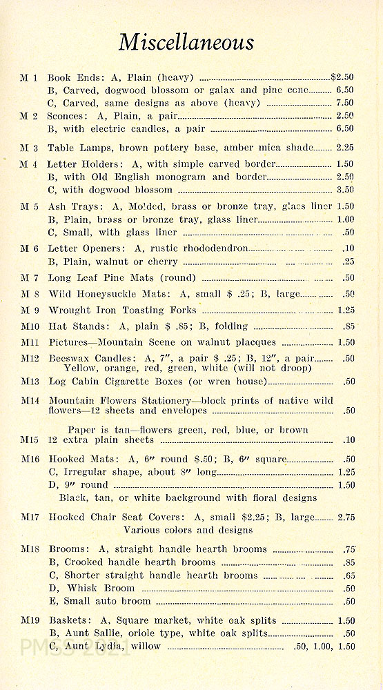 [005] “MISCELLANEOUS” price list, including bookends, sconces, table lamps, letter holders, ash trays, letter openers, longleaf pine mats, wild honeysuckle mats, toasting forks, hat stands, pictures, beeswax candles, cigarette boxes, stationery, hooked mats and chair seat covers, brooms, baskets, pine cone turkeys, cornshuck dolls.