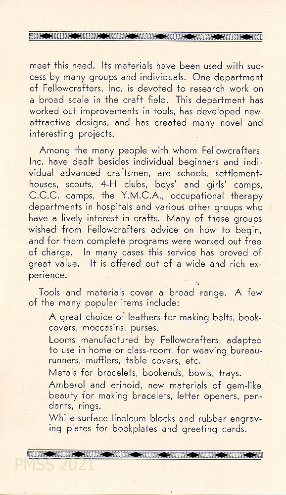 “The large increase of interest in the handicrafts is one of the encouraging signs of the times…..Fellowcrafters, Inc., identifies itself completely with the spread of the craft idea through its research, commercial and educational activities. …” Provides contact information in Boston, MA.