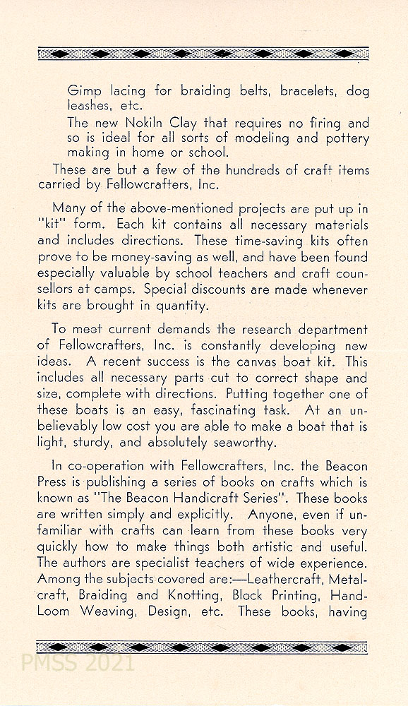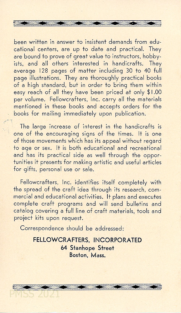 “In co-operation with Fellowcrafters, Inc., the Beacon Press is publishing a series of books on crafts which is known as ‘The Beacon Handicraft Series.” Lists examples of the subjects in the books.