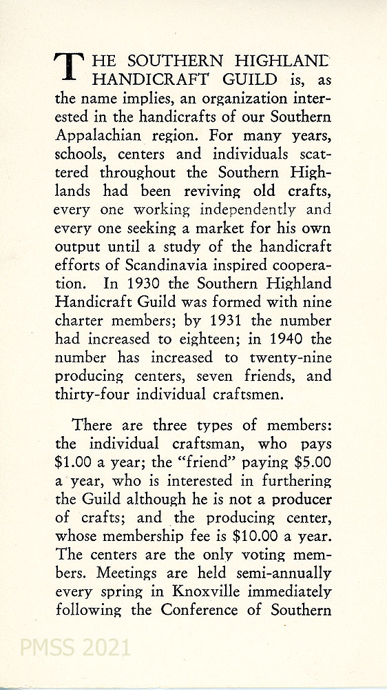 [1942_002]The Southern Highland Handicraft Guild…is an organization interested in the handicrafts of our Southern Appalachian region.” Formed in 1930 “with nine charter members; … in 1940 the number has increased to twenty-nine producing centers, seven friends, and thirty-four individual craftsmen.” Three types of members: the individual craftsman ($1.00 a year membership fee); the “friend” ($5.00 a year) and the producing center ($10 a year).