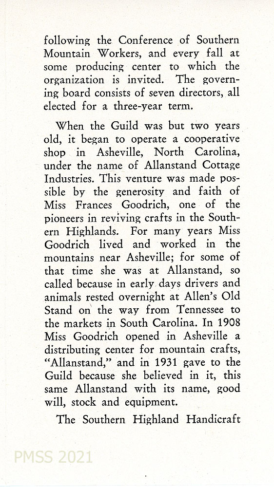 [nd_003] … and governing board. The Guild began as Allanstand Cottage Industries in Asheville, NC, made possible by Miss Frances Goodrich. Describes the origin of the name “Allenstand” and Miss Goodrich’s donation to the Guild of “Allenstand,” her distributing center for mountain crafts.