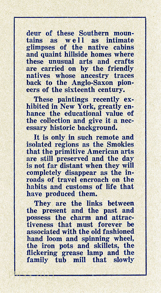 [002] “… These paintings recently exhibited in New York, greatly enhance the educational value of the collection and give it a necessary historic background. It is only in such remote and isolated regions as the Smokies that the primitive American arts are still preserved and the day is not far distant when they will completely disappear as the inroads of travel encroach on the habits and customs of life that have produced them .. ”
