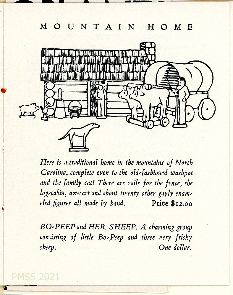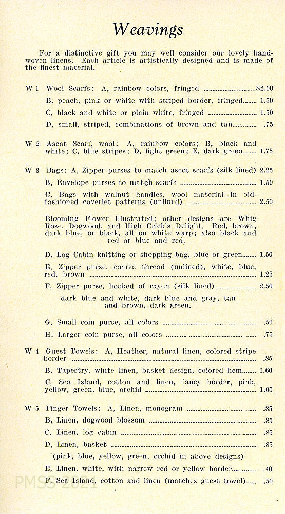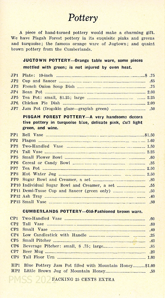 [002] POTTERY … We have Pisgah Forest pottery in its exquisite pinks and greens and turquoise; the famous orange ware of Jugtown; and quaint brown pottery from the Cumberlands.” Price lists for various types of pottery.