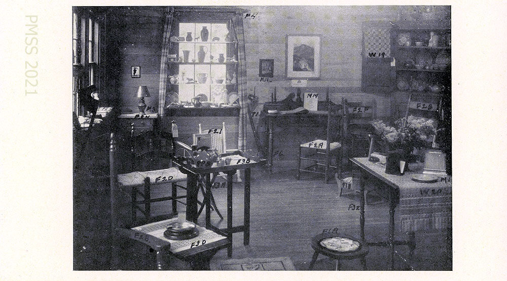 [toys_003] History, continued: Biltmore experiment, Mr. George W. Vanderbilt, weaving, toys, wood-carving, display and sales room in the tiny custard-colored house, young people.