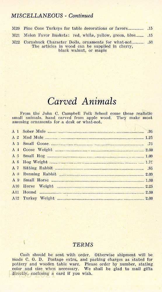 [006] CARVED ANIMALS price list. “From the John C. Campbell Folk School come these realistic small animals, hand-carved from applewood. …” Statement of “TERMS.”