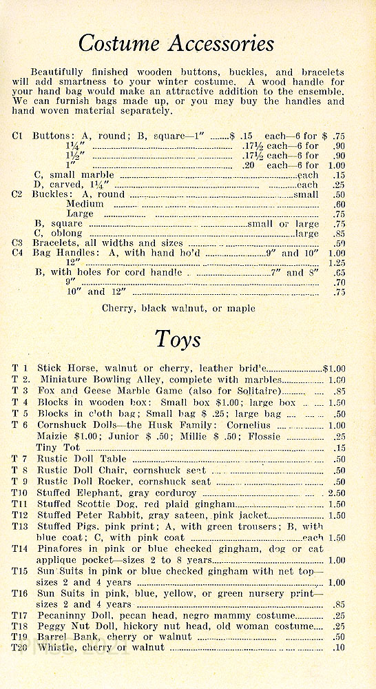 [011] “COSTUME ACCESSORIES” price list: “Beautifully finished wooden buttons, buckles, and bracelets….” and wooden handles for purses.