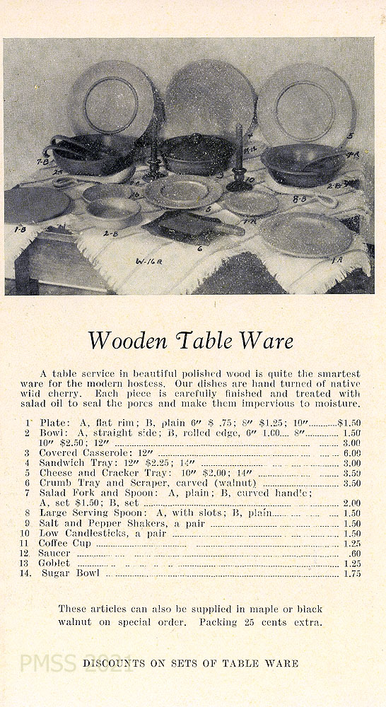“These articles can also be supplied in maple or black walnut on special order. … Discounts on sets of table ware.”