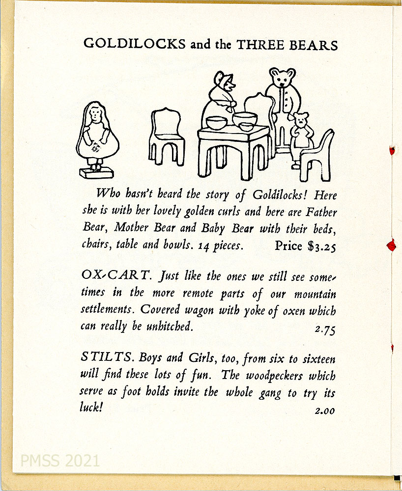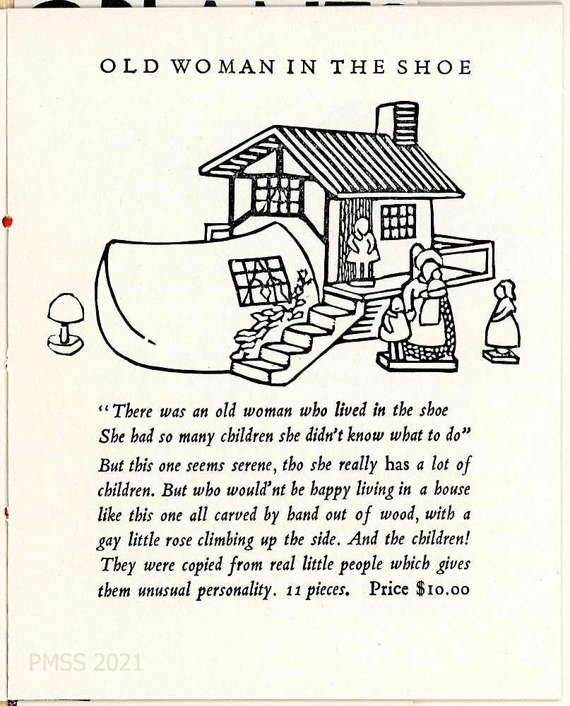 [toys_004] “OLD WOMAN IN A SHOE” – Describes a miniature hand-carved wooden house with the woman and children “copied from real little people which gives them unusual personality. 11 pieces. Price $10.00.” Image: Line drawing of toy.