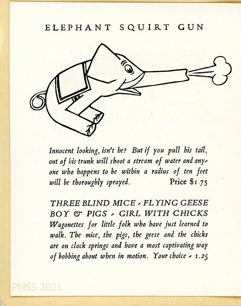 [toys_011] List with descriptions and prices, continued: “TIP-TOP COFFEE TABLE, BOOK-ENDS, BAG-TOPS, FOOT STOOL, CIGARETTE TRAY, BOWL OF FLOWERS, PAPER KNIVES, NUT BOWL”